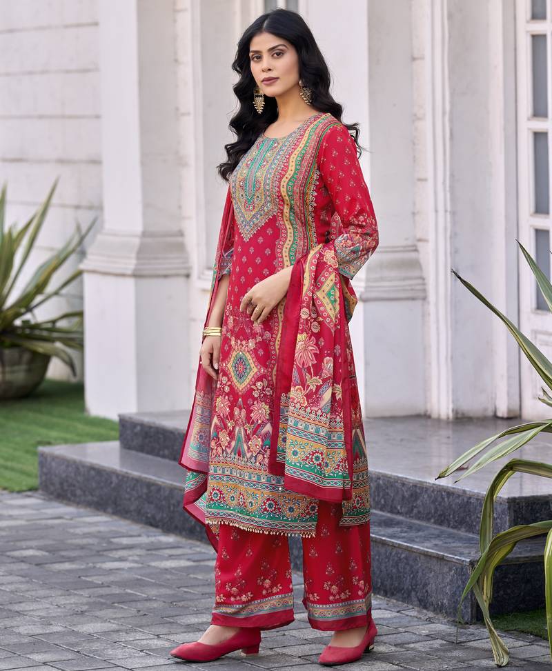 This Red Chinon Chiffon Straight Kurta Showcases Elegant Abstract Prints With Mirror, Bead, And Lace Embellishments. It Is Paired With A Fully Elasticated Printed Palazzo And A Matching Chinon Chiffon Printed Dupatta, Creating A Refined And Stylish Ensemble Perfect For Festive And Special Occasions.