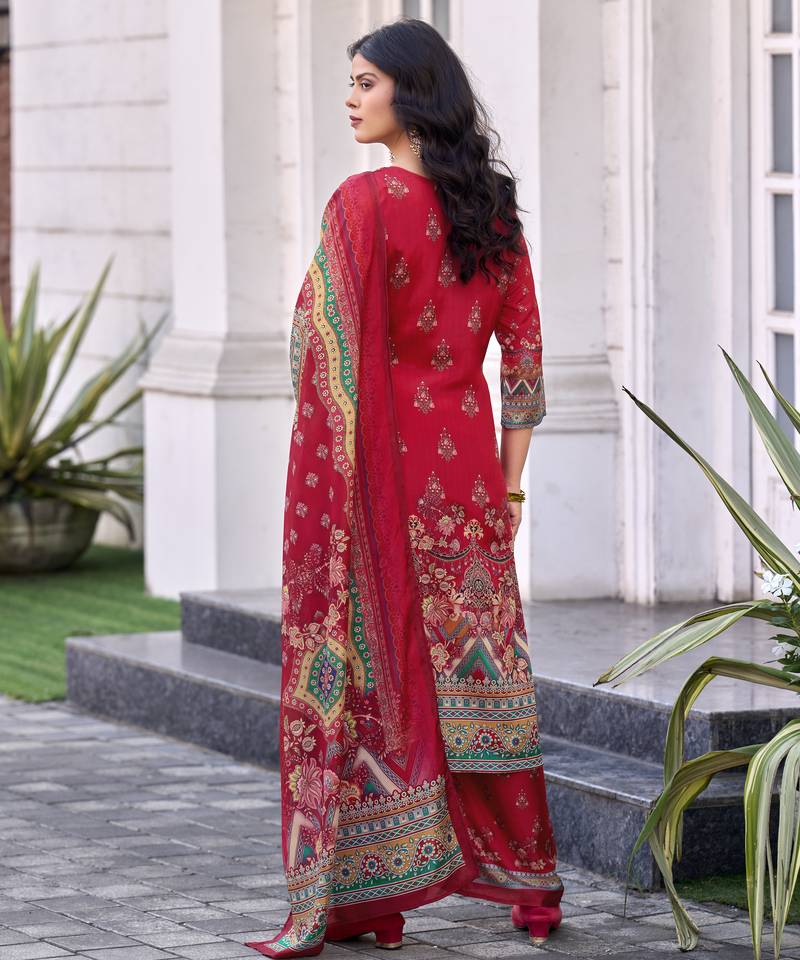 Product Name Red Chinon Chiffon Abstract Printed Straight Kurta With Palazzo & Printed Dupatta