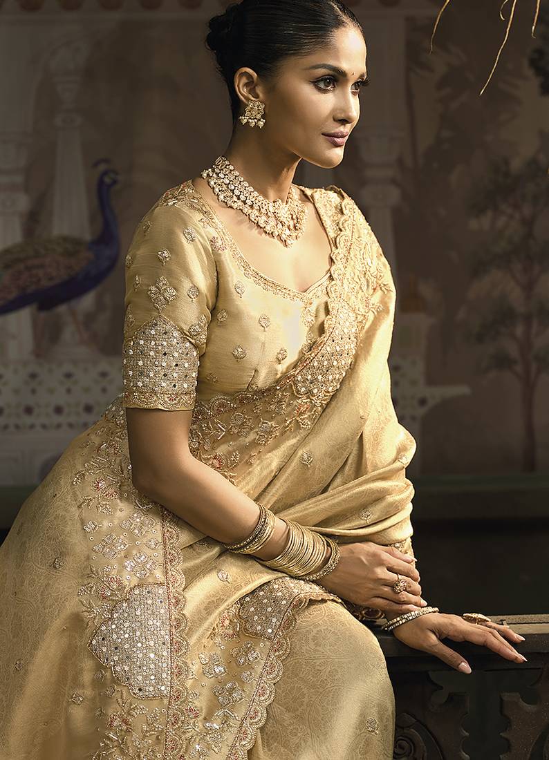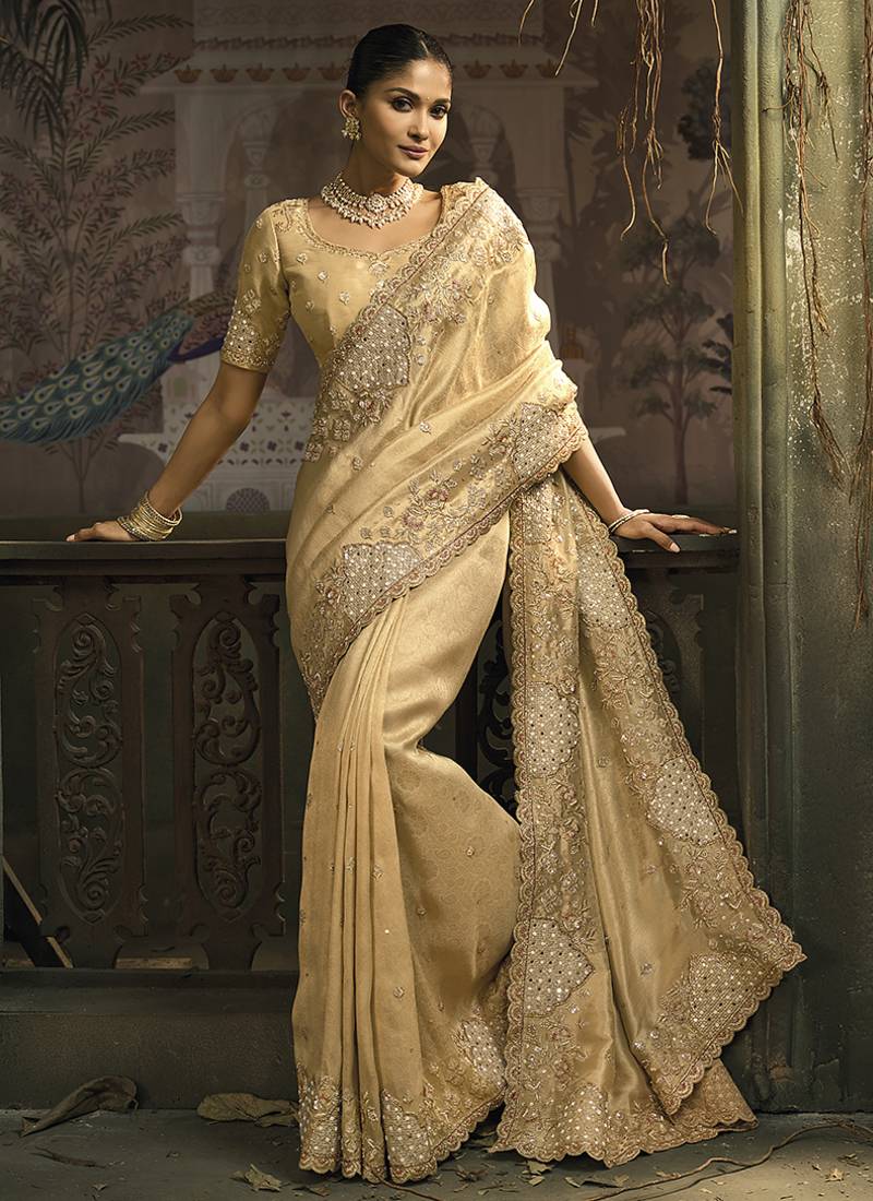 Beige silk blend wedding saree with cut dana, embroidered, moti and zari work