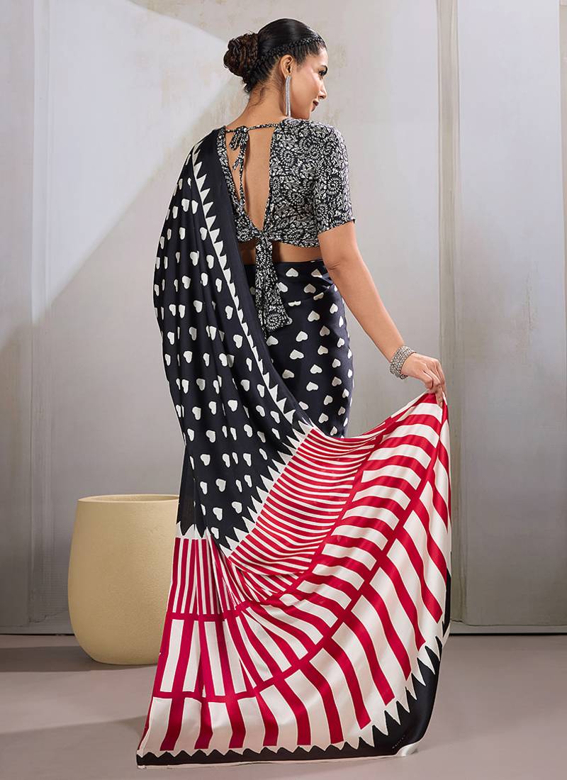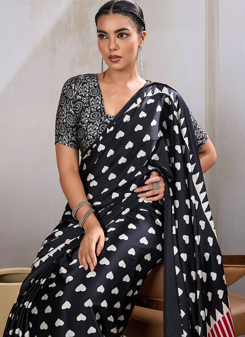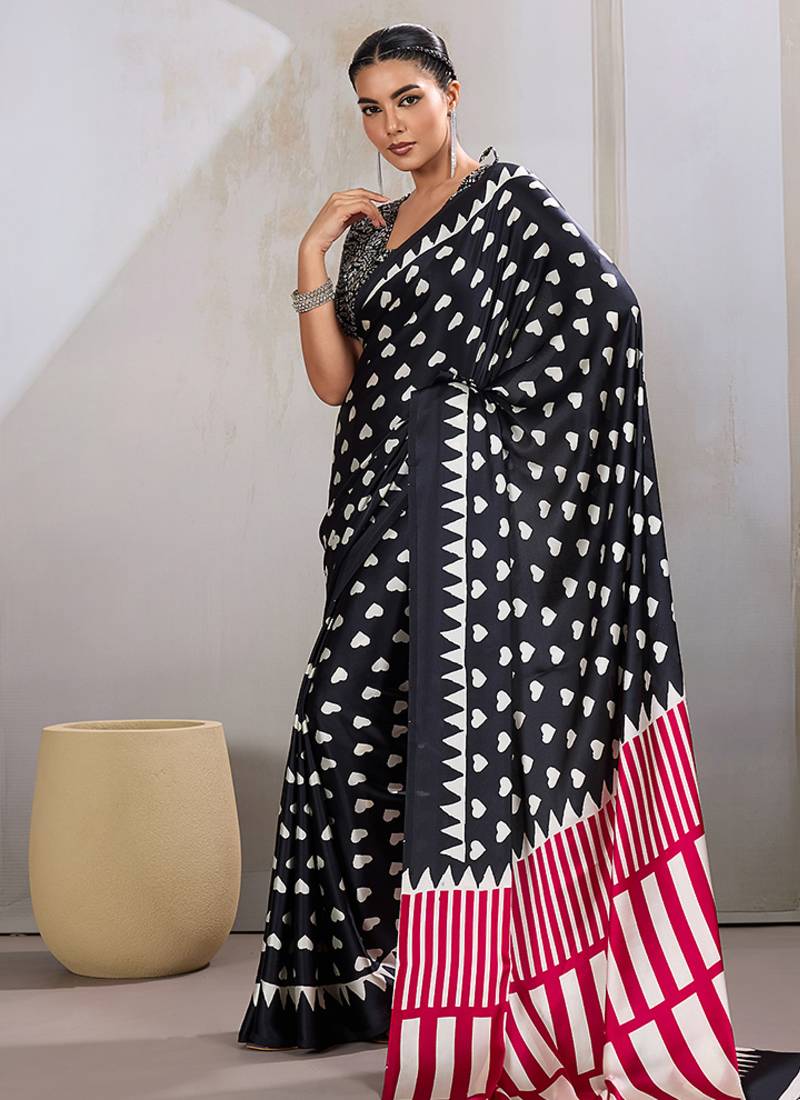 Black printed satin saree