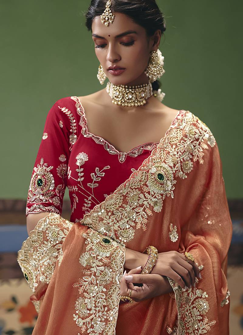 Coral fancy fabric embroidered saree