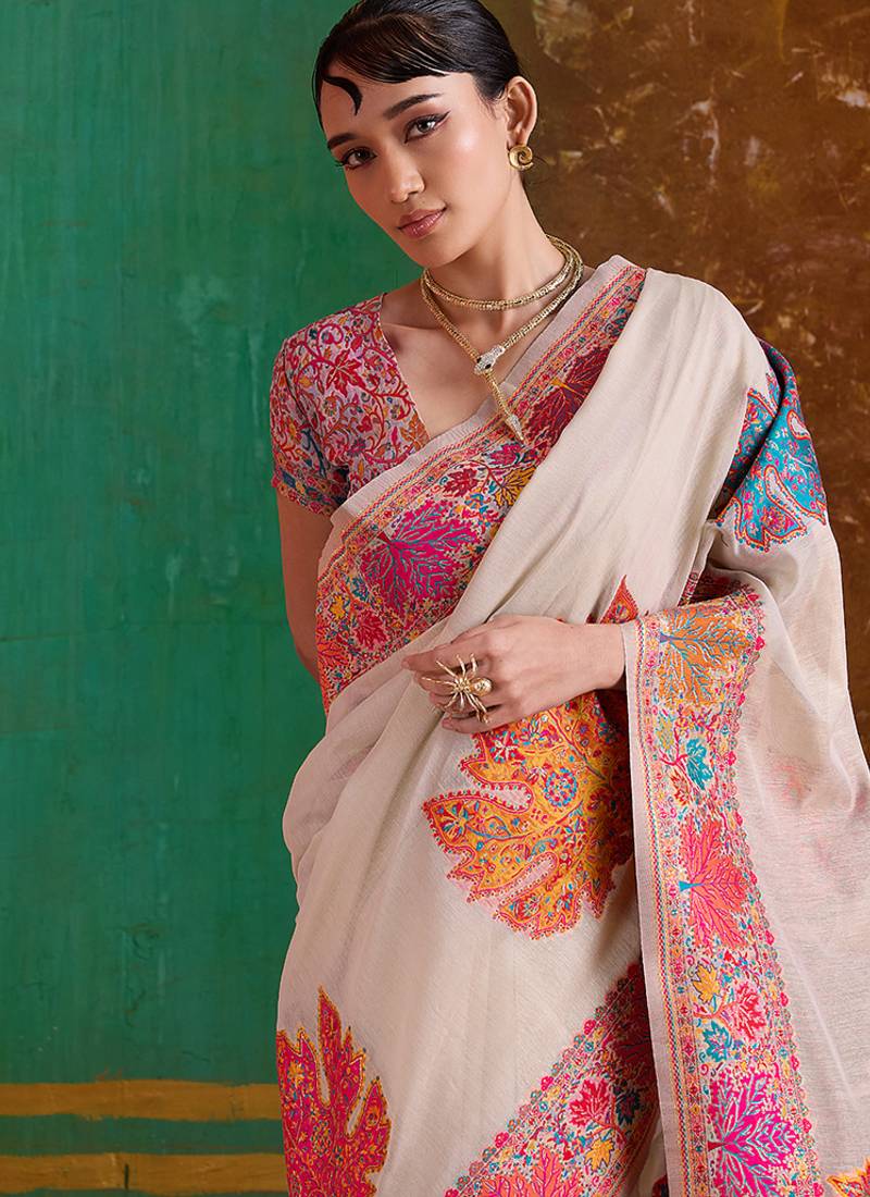 Cream cotton blend weaving contemporary saree