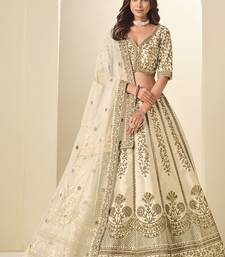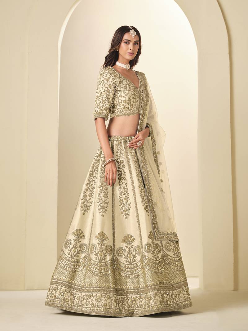 This Cream Art Silk Lehenga Choli Is Adorned With Delicate Embroidery, Resham Detailing, And Subtle Sequins That Create A Luxurious, Textured Look Perfect For Weddings And Festive Occasions. The A Line Skirt Flows Gracefully, Offering A Flattering And Elegant Silhouette, While The V Neck, Half Sleeved Blouse Carries Matching Embellishments For A Coordinated And Refined Ensemble. Completed With A Matching Net Dupatta Featuring Embroidered Edges, This Semi Stitched Lehenga Choli Blends Traditional Craftsmanship With Contemporary Design, Making It Ideal For Brides, Wedding Guests, Or Celebratory Events Where Sophistication And Subtle Glamour Are Desired.