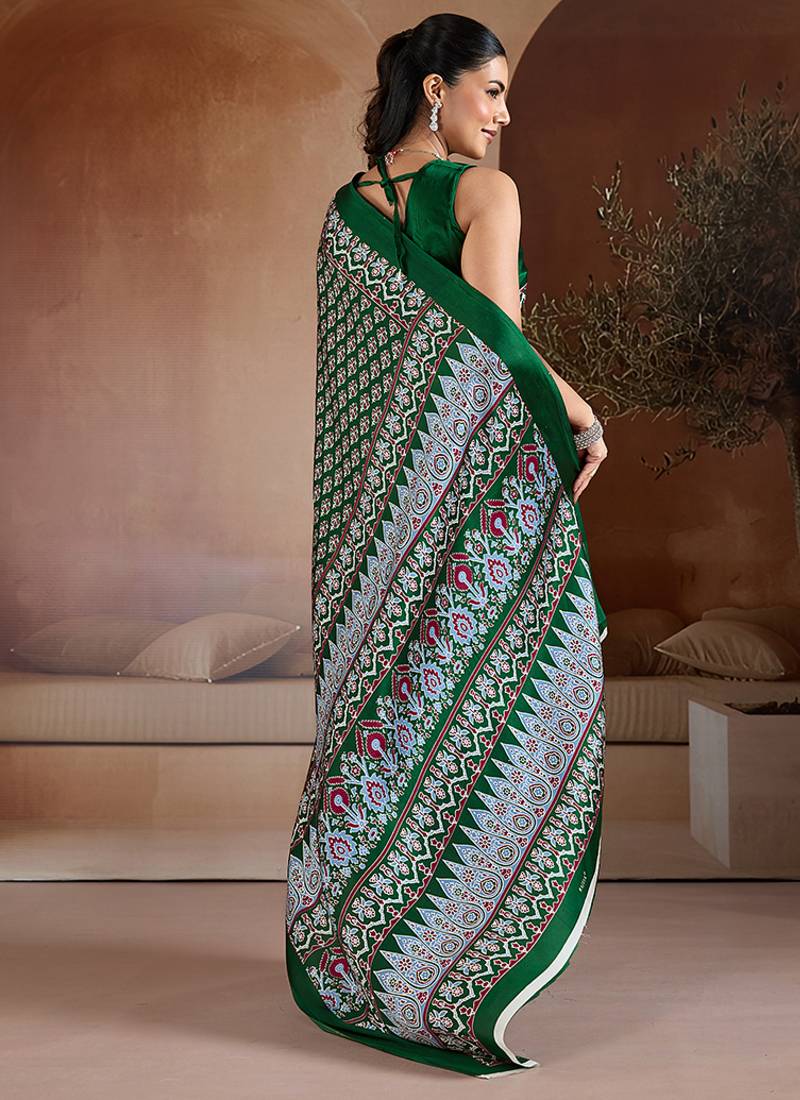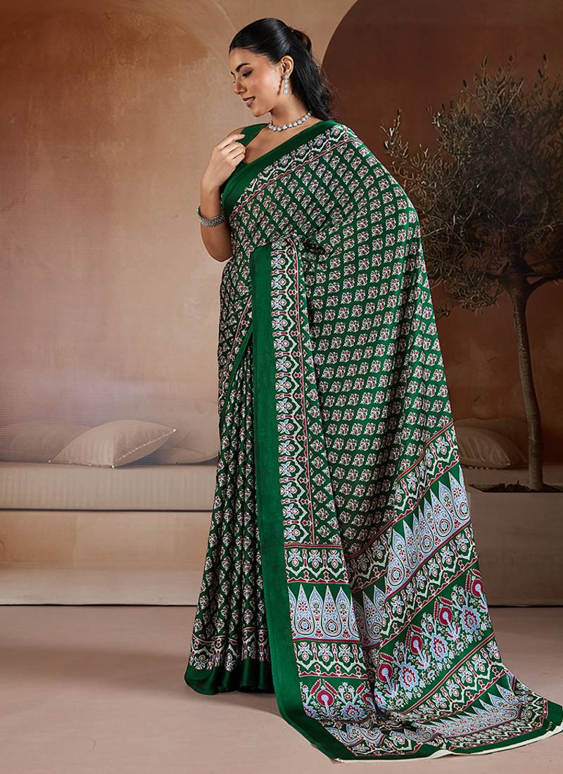 Dark green printed satin saree