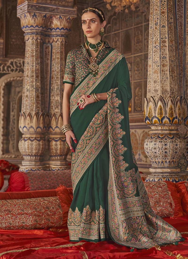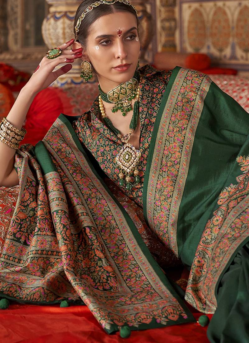 Dark green silk blend print work traditional saree for ceremonial