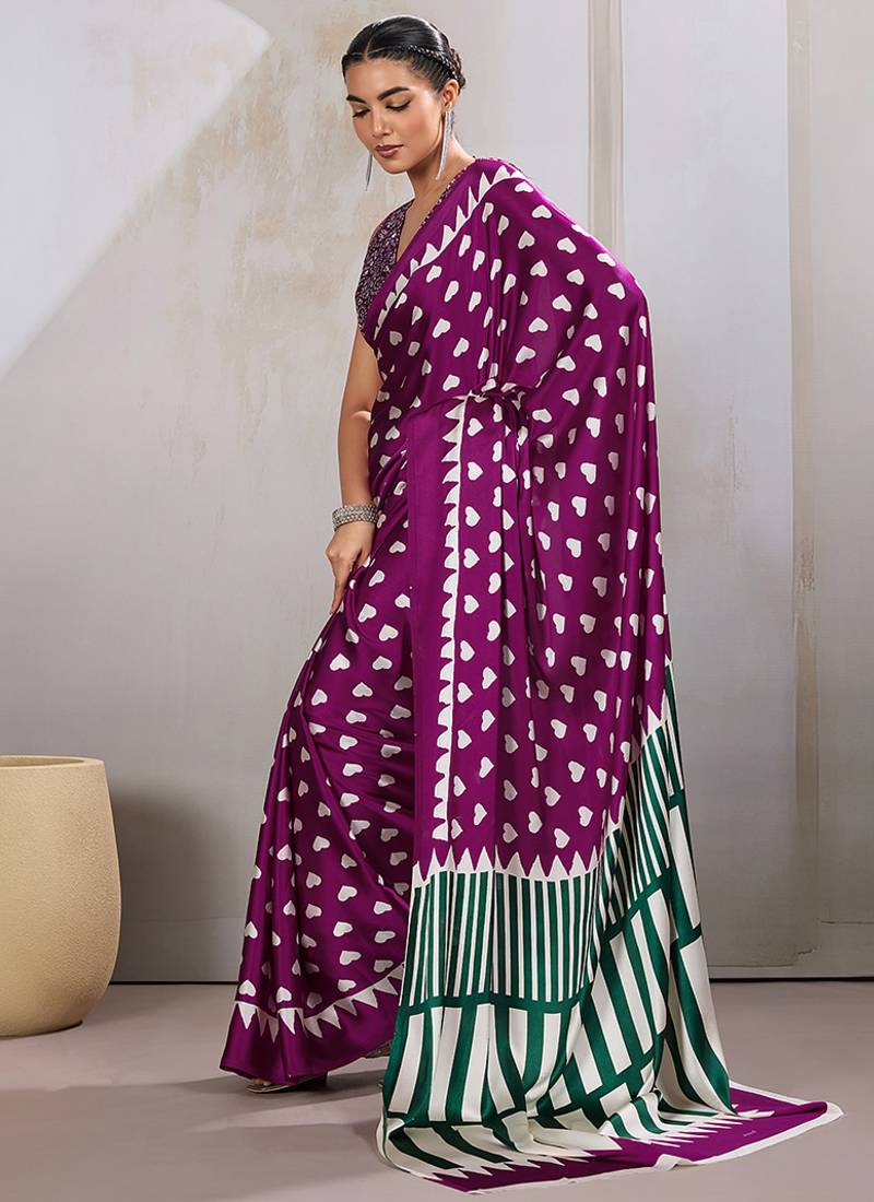 Dark magenta printed satin saree