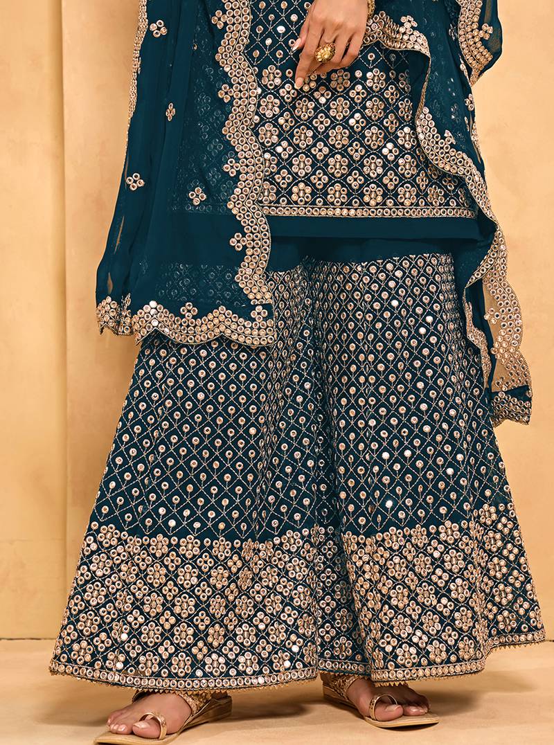 | Product Description | Monjoilika Fashion Presents Unique Elegance Will Come Out From Your Dressing Trend With This Dark Teal Colour Georgette Sharara Set. The Embroidered Work Work Looks Chic And Excellent For Any Affair. Comes With Matching Georgette Sttiched Bottom And Inner Santoon And Georgette Dupatta |