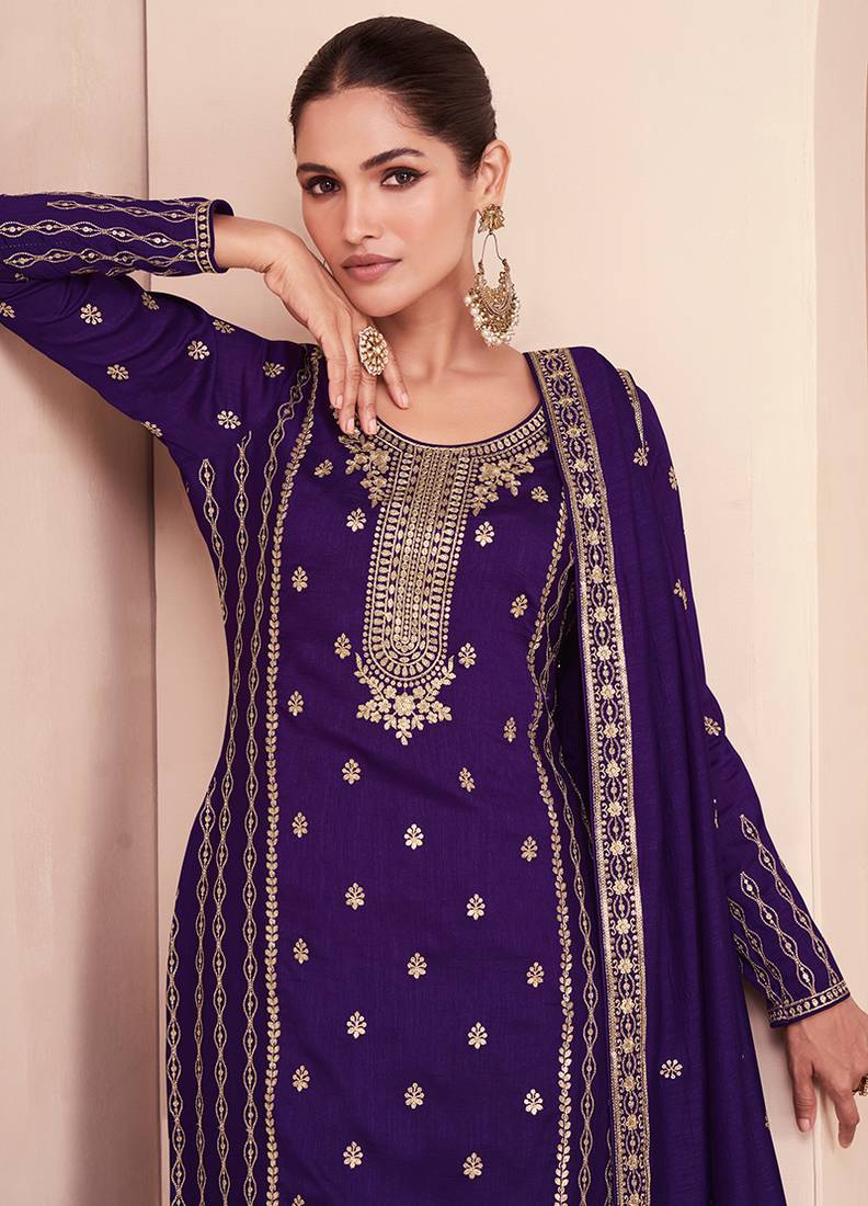 Grab The First Look In This Dark Violet Colored Premium Silk Palazzo Dress. This Free Size Stitched Suit Is Beautifully Adorned With Amazing Zari Embroidery Work And Sequins Work. This Suit Comes Along With Matching Inner, Bottom And Dupatta Which Makes It Appear More Adorning. It Can Be Customized Upto Size 42".