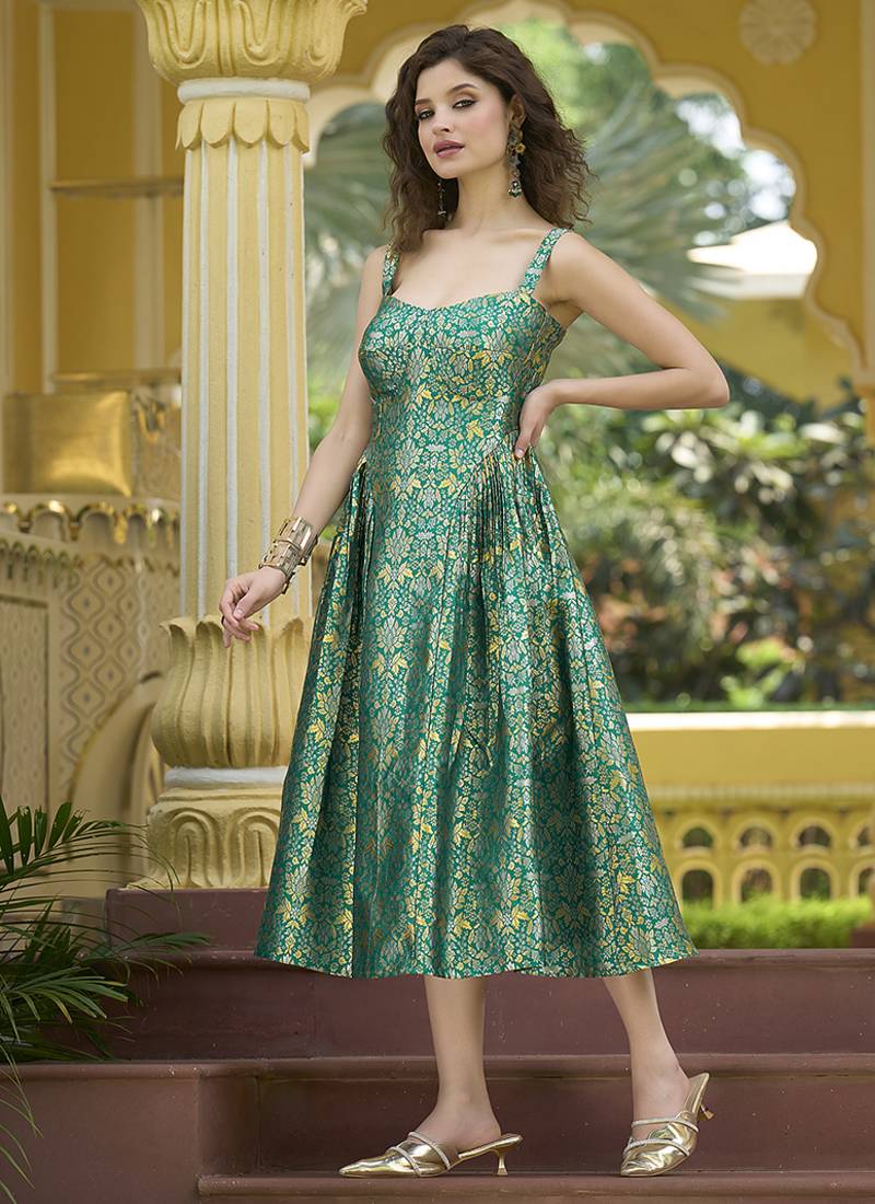 | Product Name | Designer Teal Jacquard Zari Woven A Line Midi Dress | |