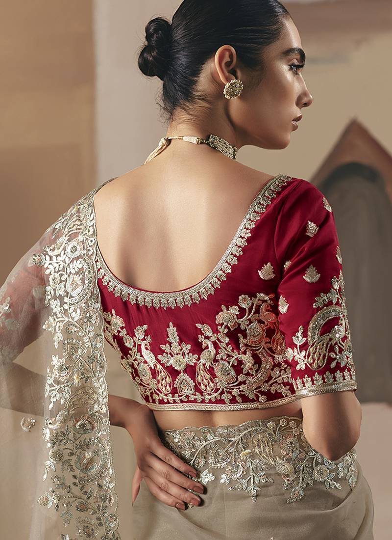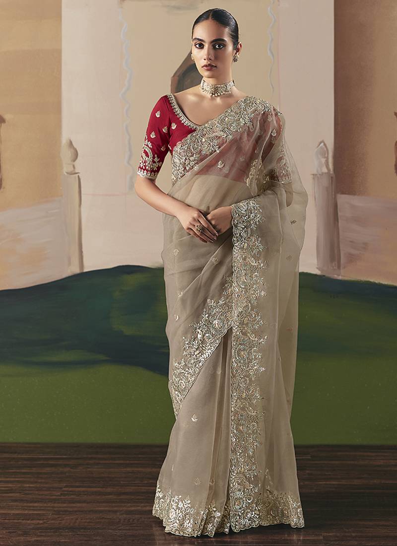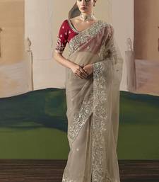 Embroidered beige fancy fabric party designer saree