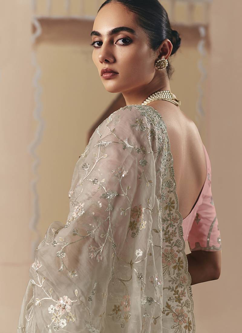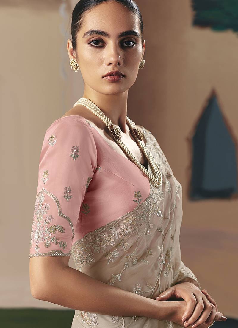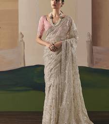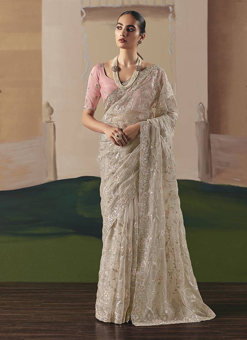 Embroidered cream fancy fabric party designer saree