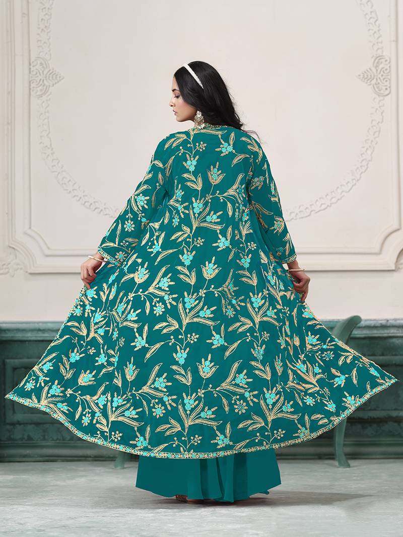 Embroidered faux georgette teal readymade salwar kameez with shrug stitched