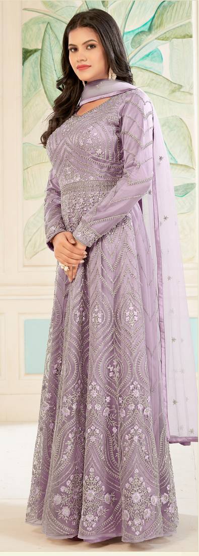 Lavender color net heavy embroidered wedding wear anarkali suit semi stitched