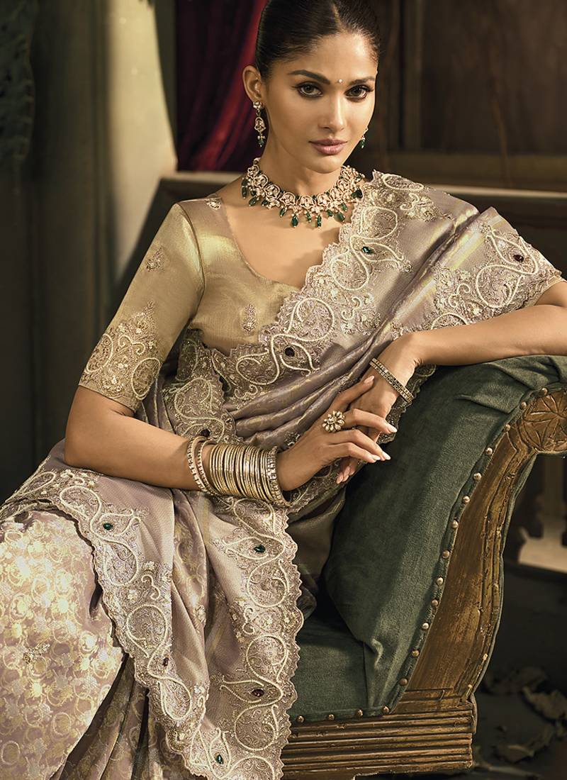 | Product Name | Light Brown Silk Blend Wedding Saree With Cut Dana, Embroidered, Moti And Zari Work | |