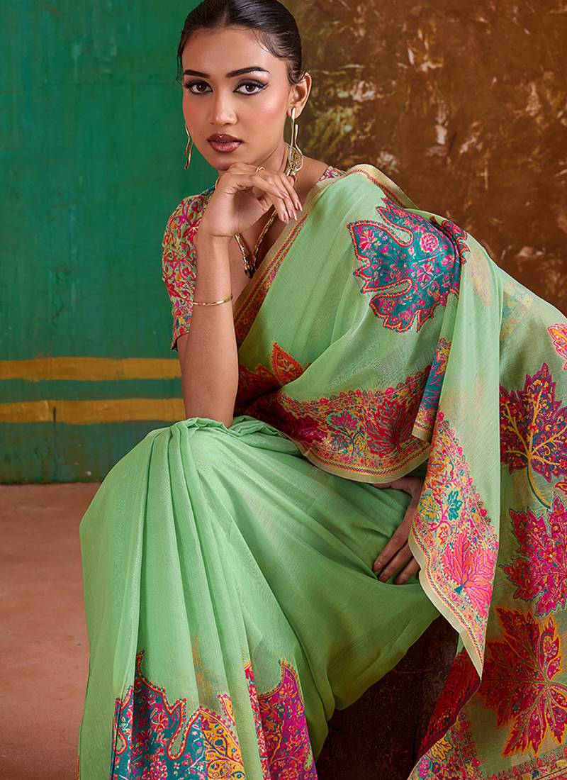 Light green cotton blend weaving contemporary saree