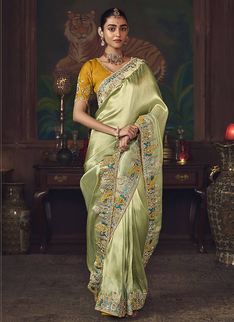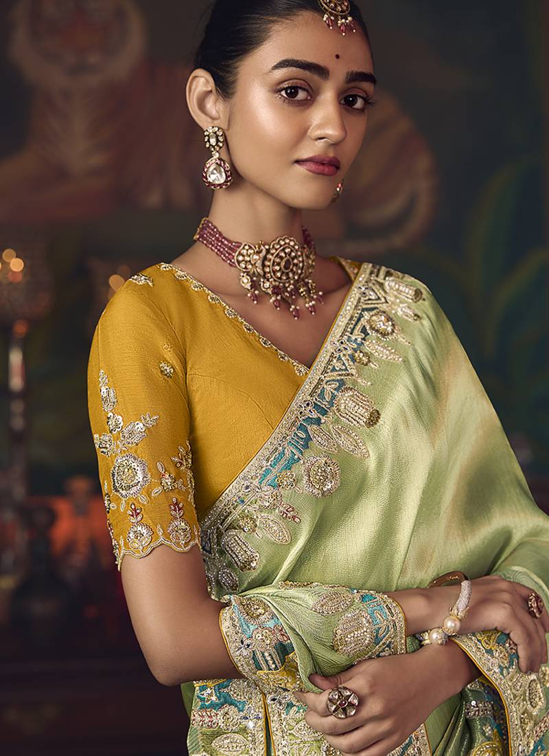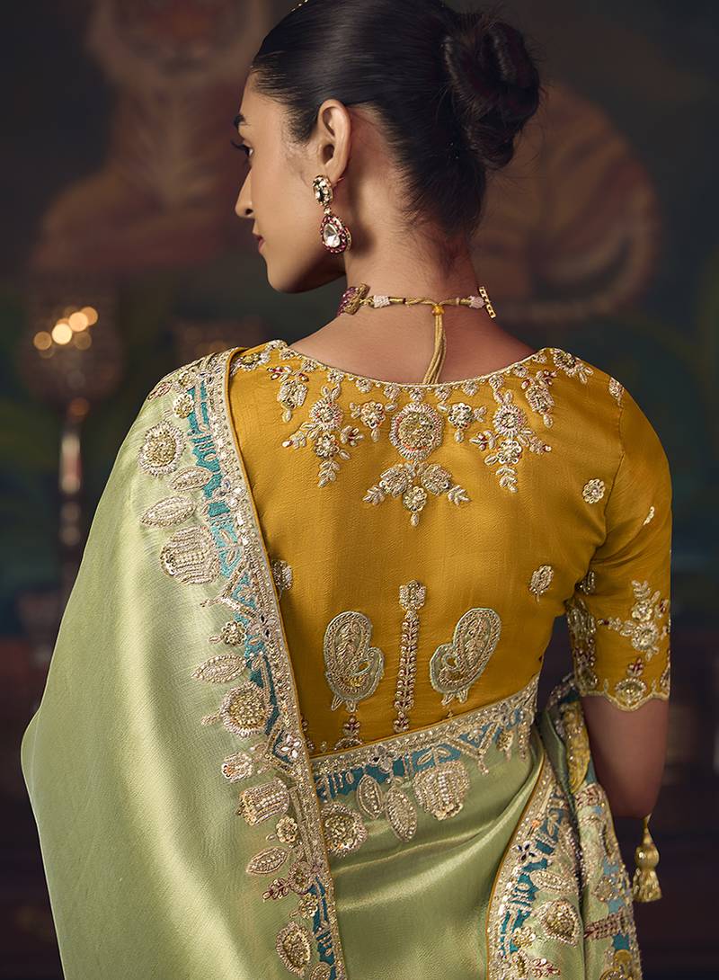 | Product Description | Elegant Light Green Silk Saree Paired With A Contrasting Mustard Blouse Adorned With Zari And Stone Detailing. Features Traditional Zari Weaving Combined With Sequins And Stone Embellishment For Regal Appeal. Ideal For Weddings, Festive Gatherings, Or Reception Events. Comes With Unstiched Blouse. (Slight Variation In Color, Fabric & Work Is Possible. Model Images Are Only Representative.) |