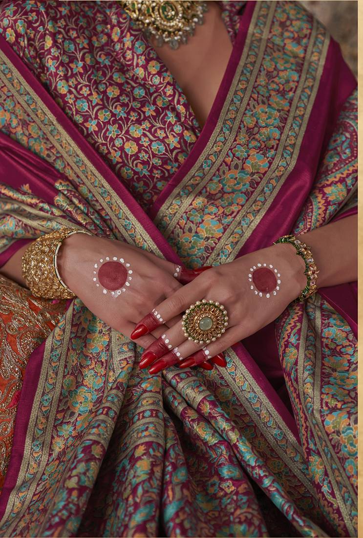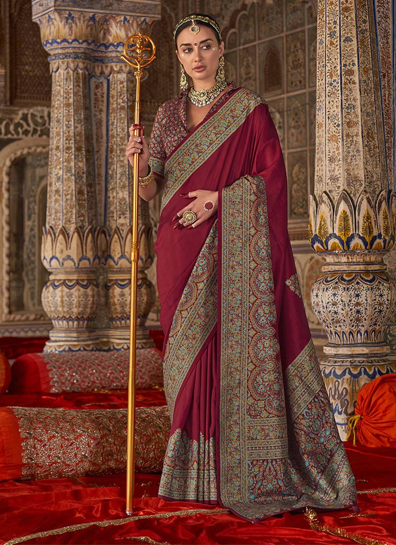 Maroon silk blend print work traditional saree for ceremonial