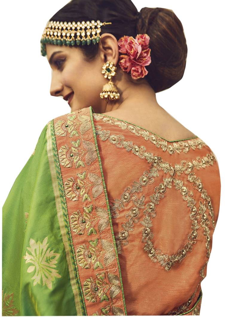 | Product Description | Parrot Green Woven Silk Designer Saree With Blouse.It Comes With Peach Silk Unstitch Blouse,Which Can Be Stitch Up To 42".Grab It Now. | |