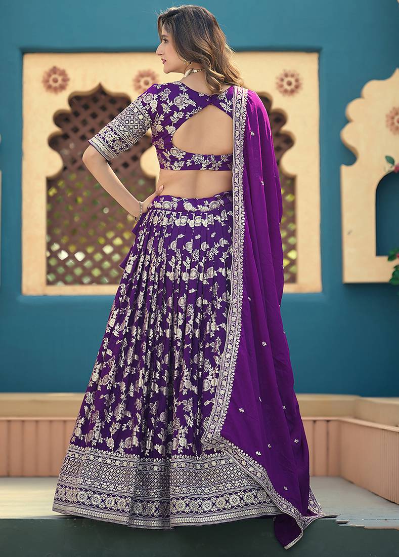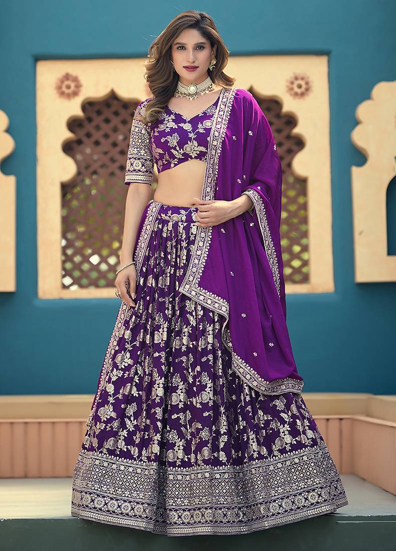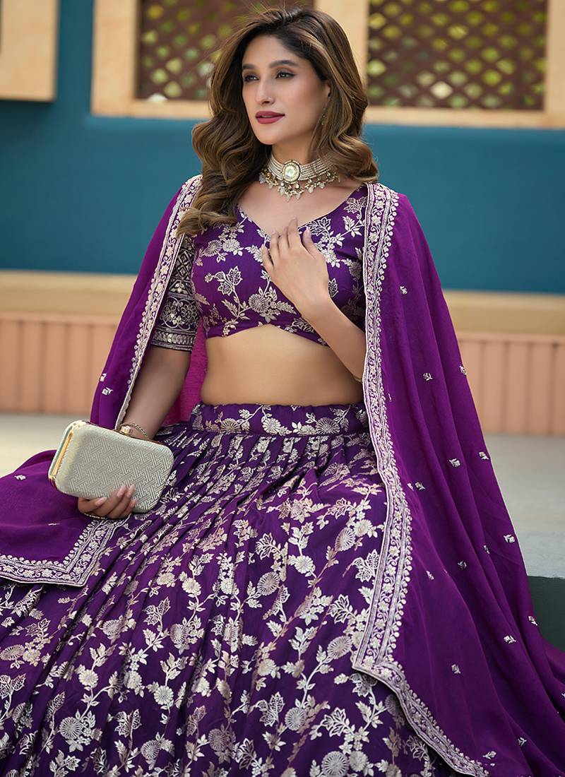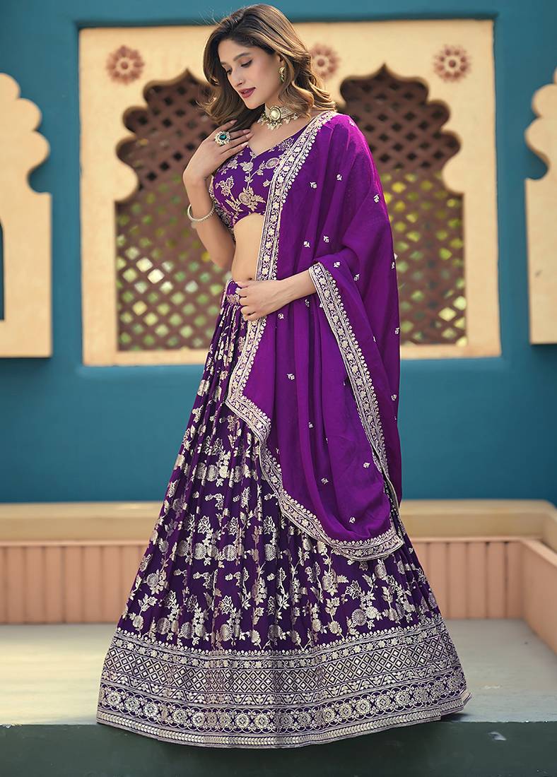 Purple embroidered dola silk jacquard designer long lehenga choli