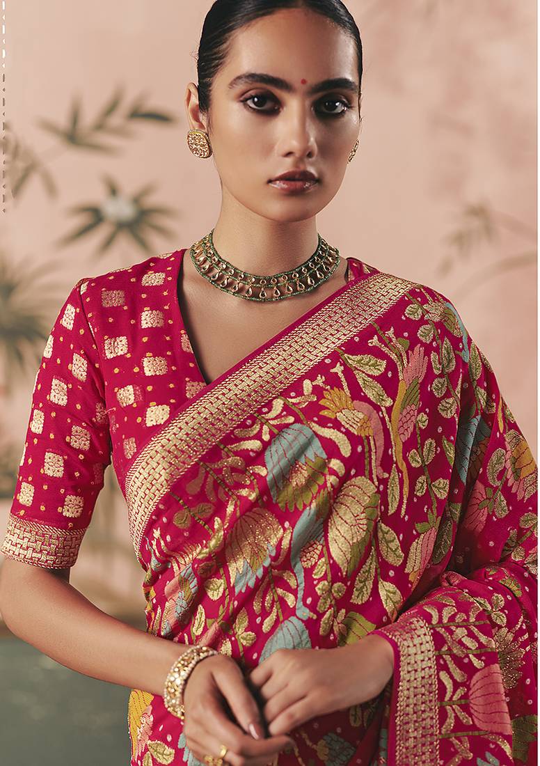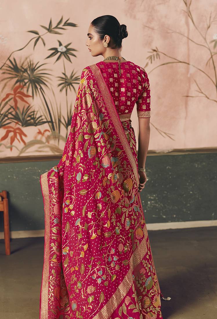 Rani pink bandhej weaving work faux khaddi georgette saree