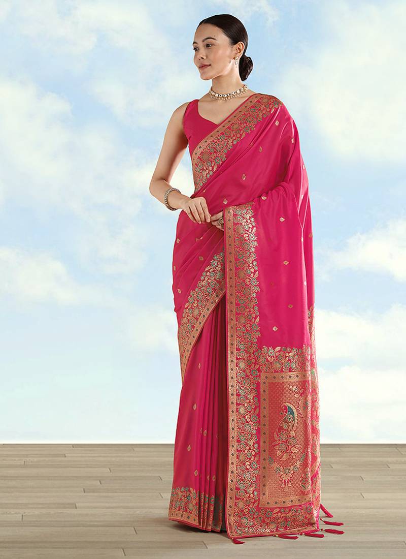 Rani pink faux banarasi satin silk saree with zari border and butti work