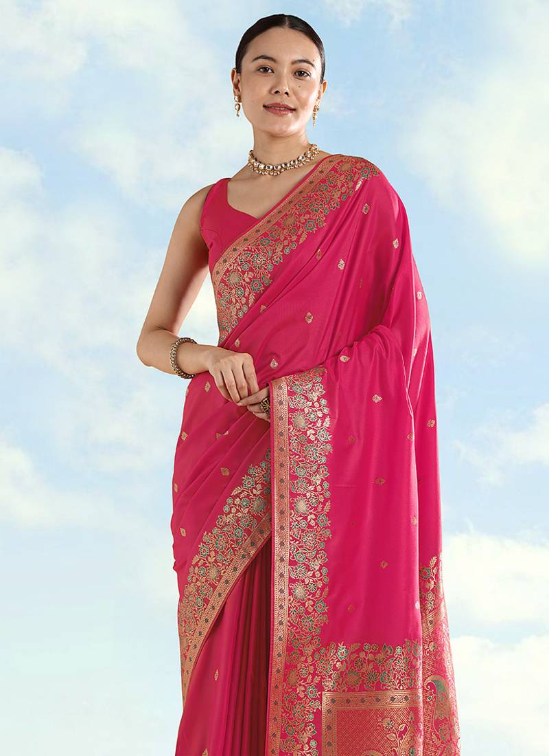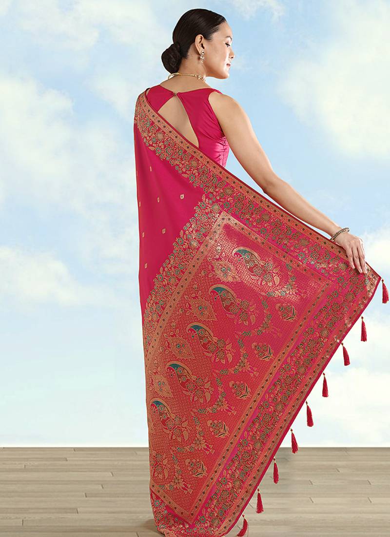 | Product Description | For Days That Mix Ceremony And Photos, This Rani Pink Faux Banarasi Soft Silk Woven Saree Balances Clean Lines With Colour Detail. Weaving Buti Motifs Weave Across The Body With A Defined Zari Border, And The Pallu Lifts The Look With Multicolour Patterning. You Feel Refined, Festive And Ready For Pooja And Karwa Chauth. |