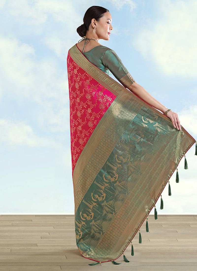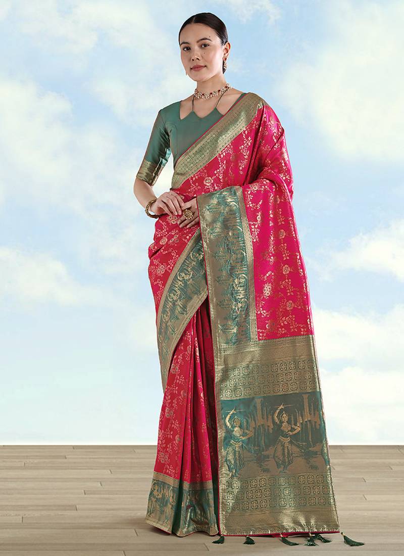 | Product Description | Temple Mornings Feel Serene While This Rani Pink Faux Banarasi Silk Saree Keeps The Look Traditional Yet Light. Zaal Patterns Span The Body; The Golden Zari Border And Pallu Weave Indian Culture Shapes, Clean Geometry, And Playful Parrots; Tassels Close The Story. Choose It For Pooja Or Karwa Chauth When You Want Depth In The Weave And A Graceful Fall. |