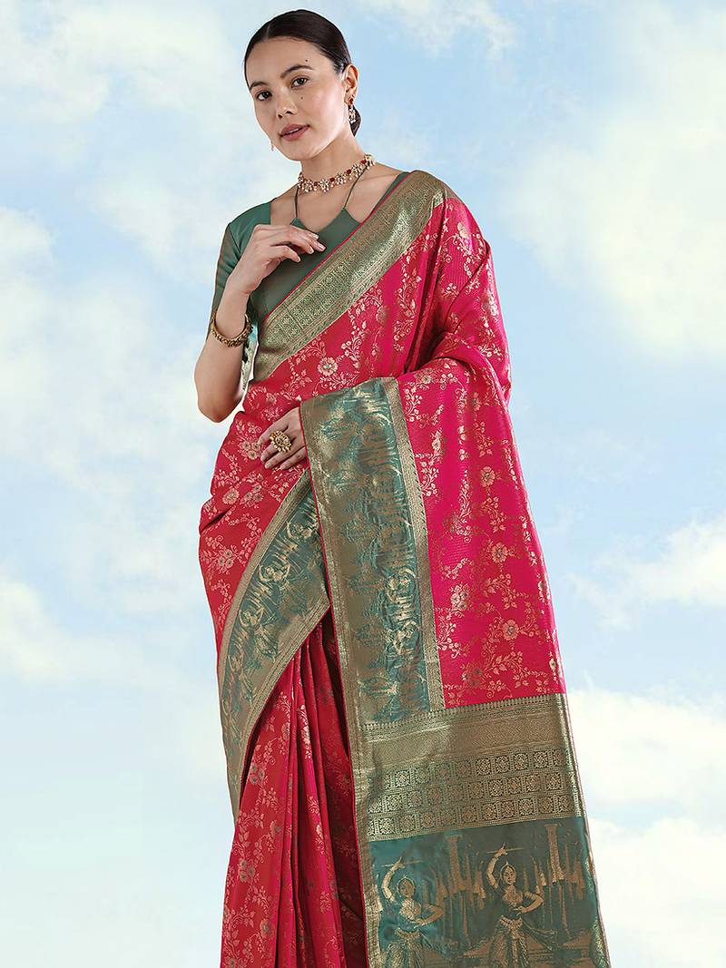 Rani pink faux banarasi silk saree with zari woven design