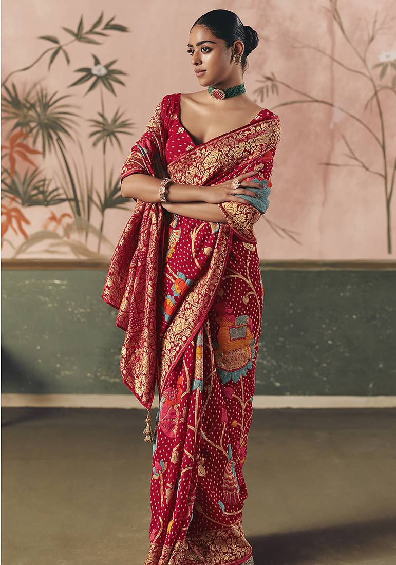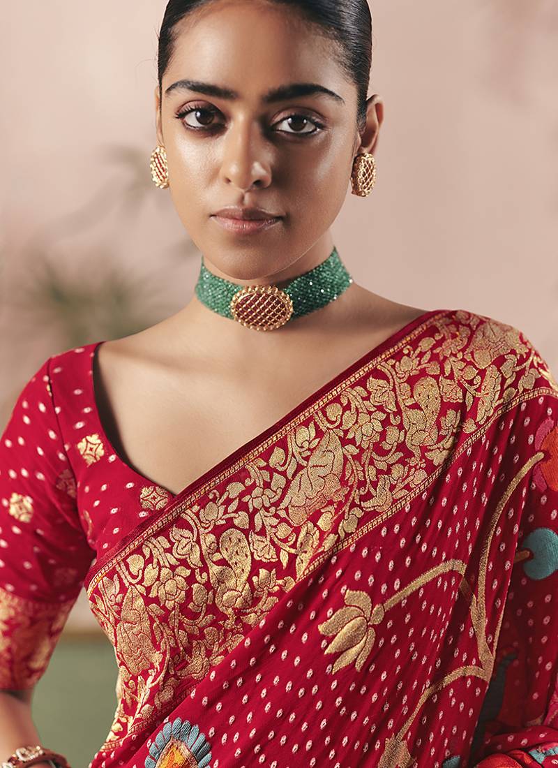 Red bandhej weaving work faux khaddi georgette saree