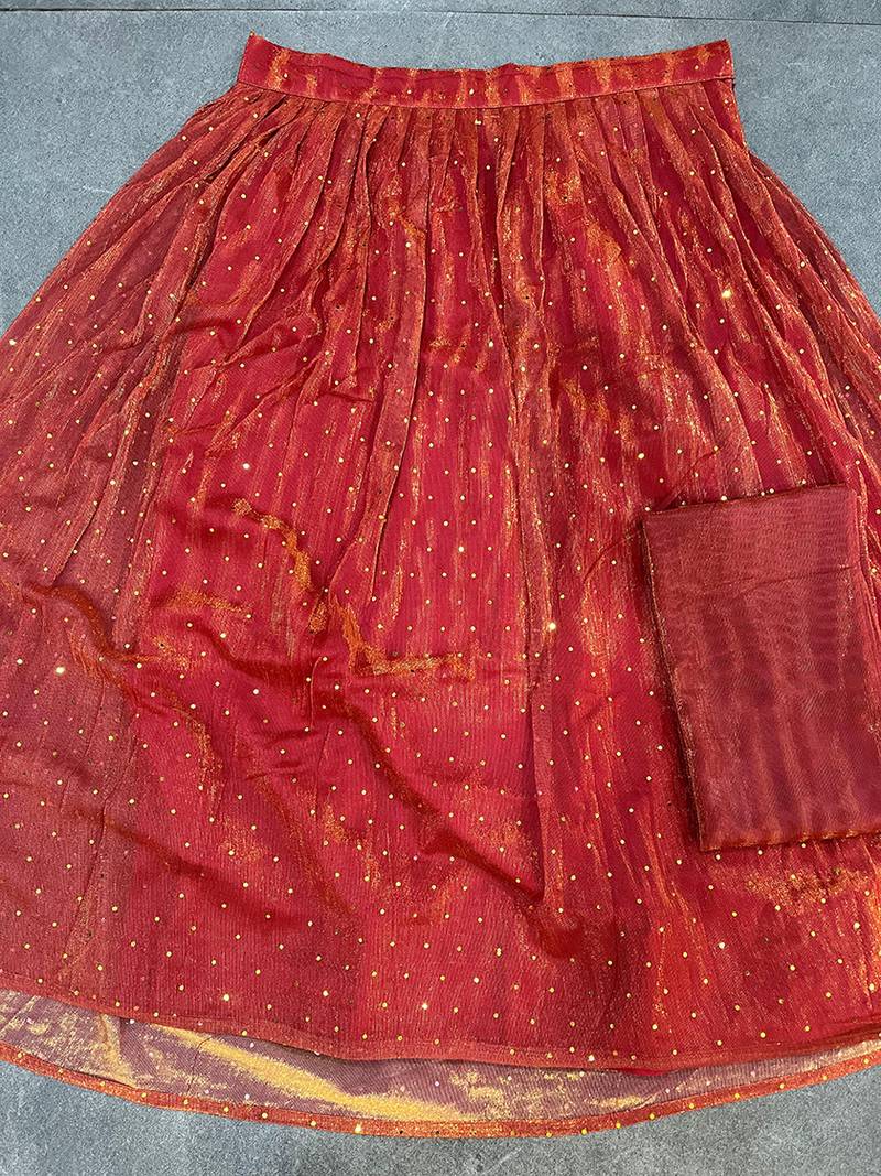 | Product Description | A Western Style Lehenga Choli With A Modern Twist Is Designed In Red Color Lycra Fabric, Known For Its Stretch And Smooth Finish. The Lehenga Features A Form Fitting Silhouette That Flares Out At The Bottom, Giving It A Graceful And Contemporary Appeal. The Entire Ensemble Is Embellished With Shimmering Sequins, Adding A Touch Of Glamour And Sparkle. The Choli (Blouse) Is Tailored In A Chic Design, With A Structured Fit That Complements The Sleek Lehenga. (Note: Lehenga Comes Stitched & Blouse Comes Unstitched.) |