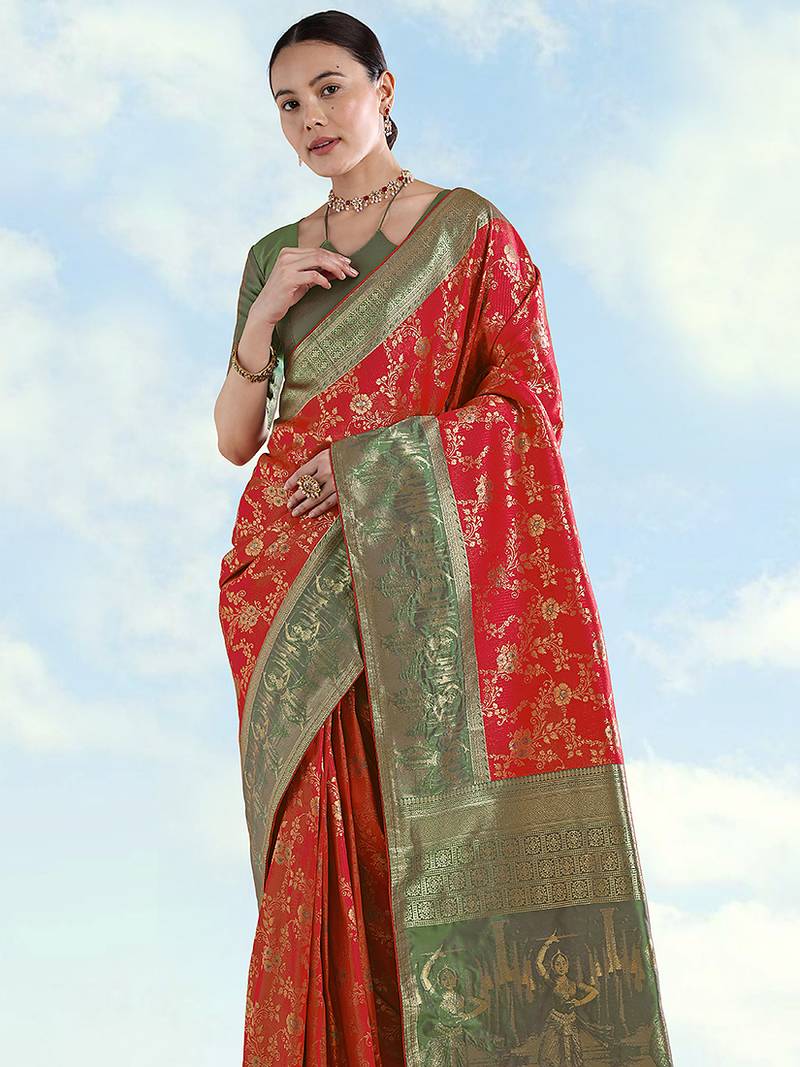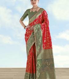 Red faux banarasi silk saree with zari woven design