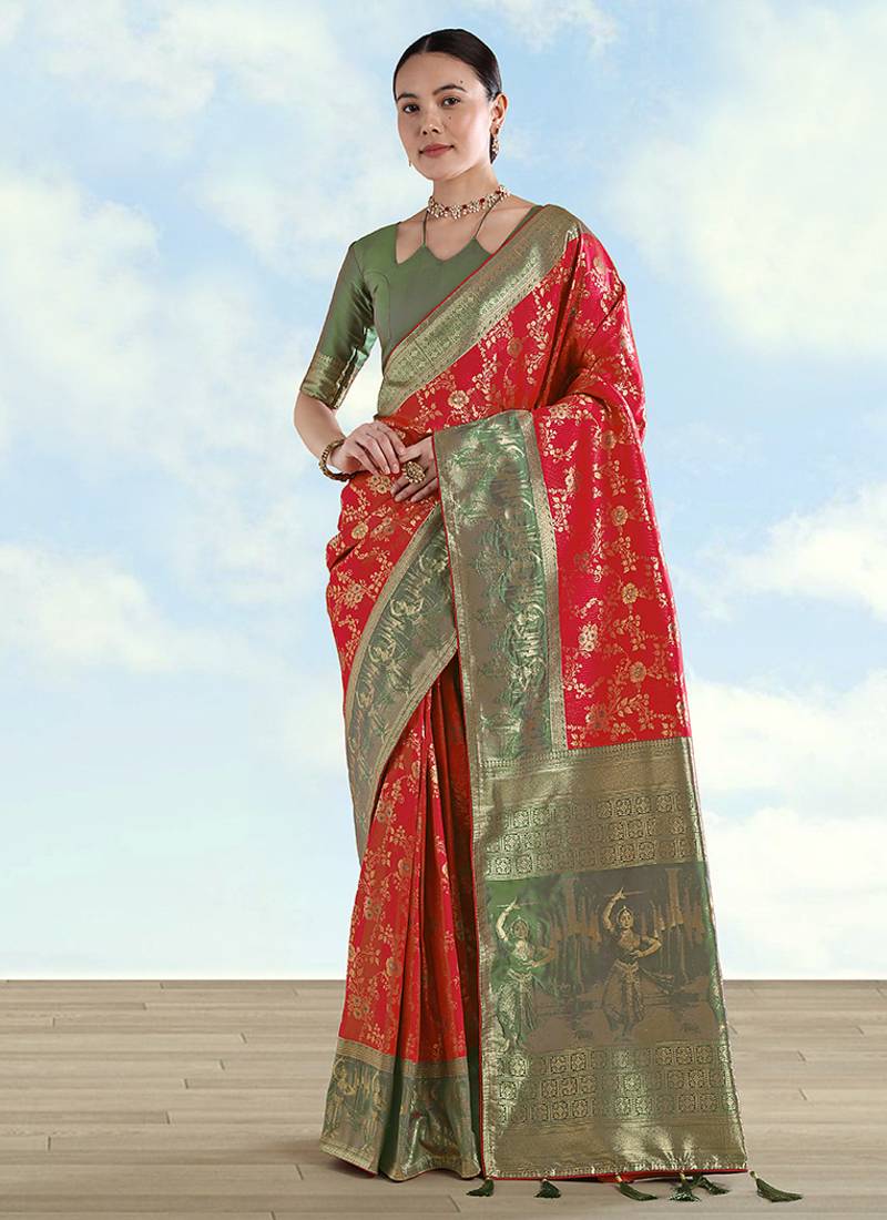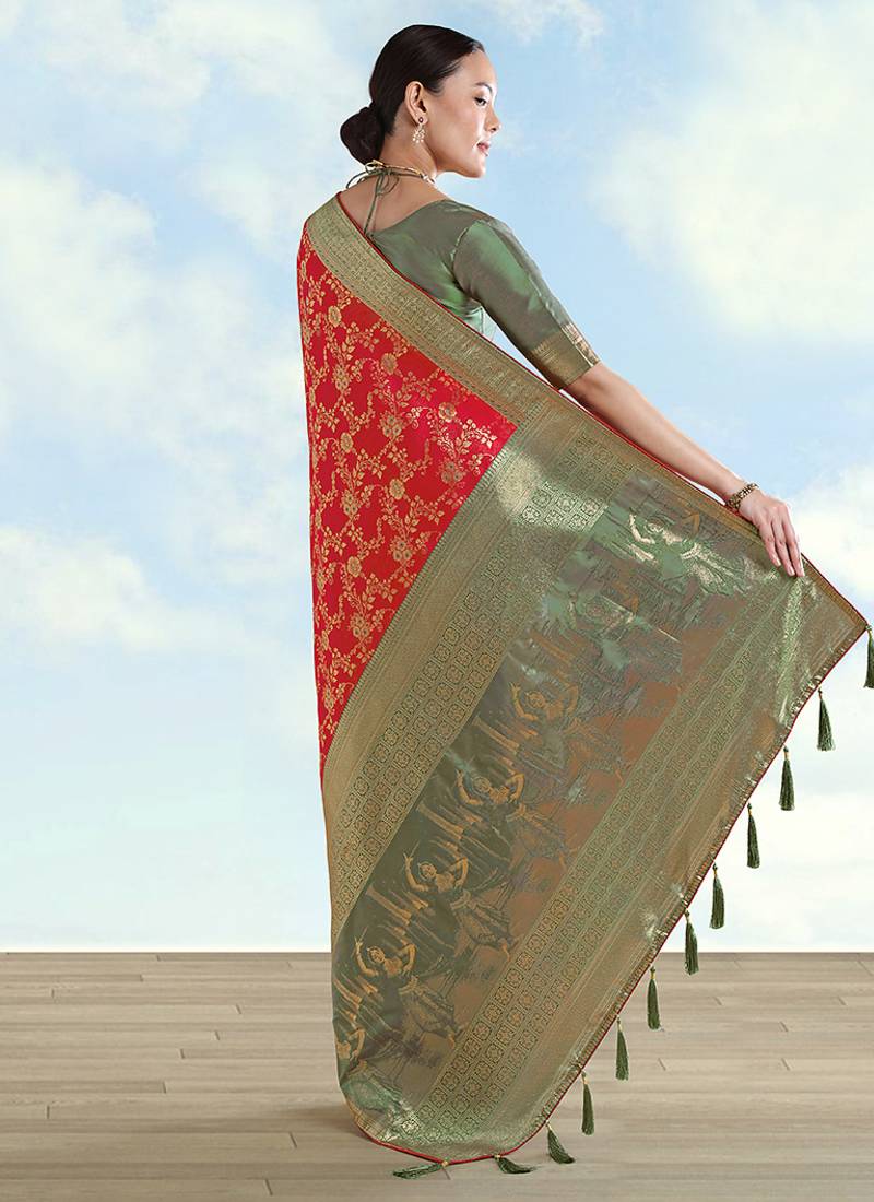 | Product Description | Temple Mornings Feel Serene While This Red Faux Banarasi Silk Saree Keeps The Look Traditional Yet Light. Zaal Patterns Span The Body; The Golden Zari Border And Pallu Weave Indian Culture Shapes, Clean Geometry, And Playful Parrots; Tassels Close The Story. Choose It For Pooja Or Karwa Chauth When You Want Depth In The Weave And A Graceful Fall. |