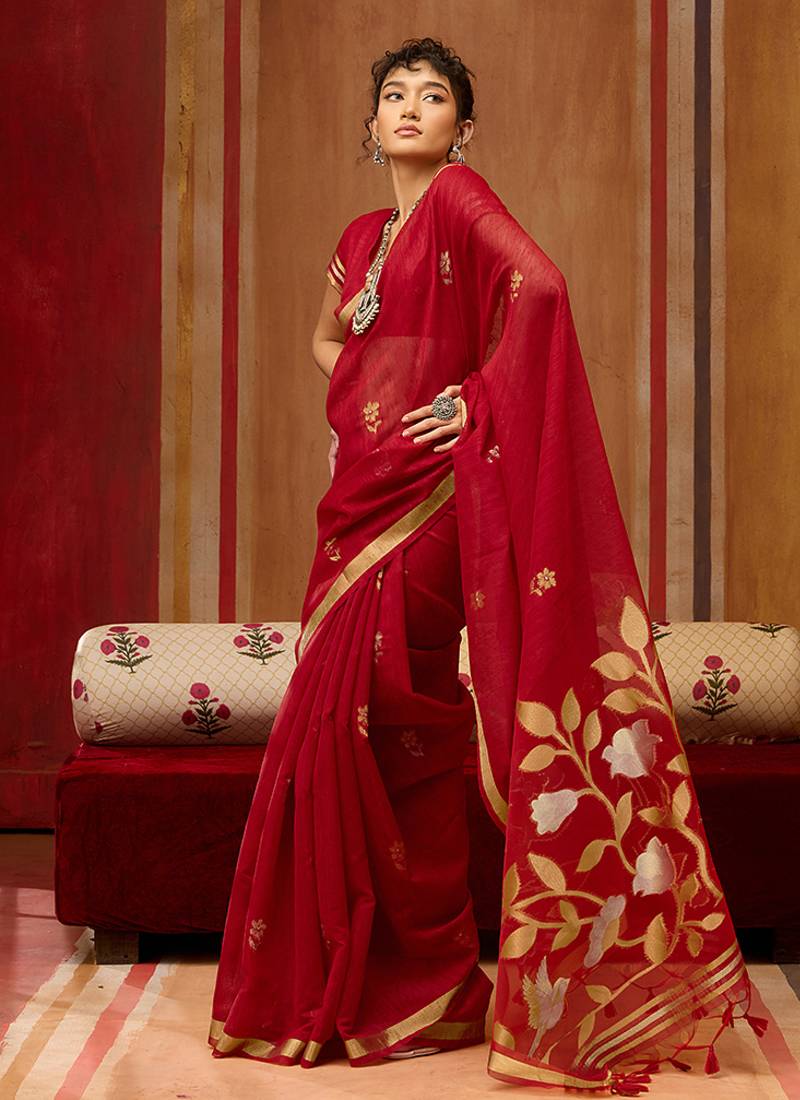 Red art silk woven work saree