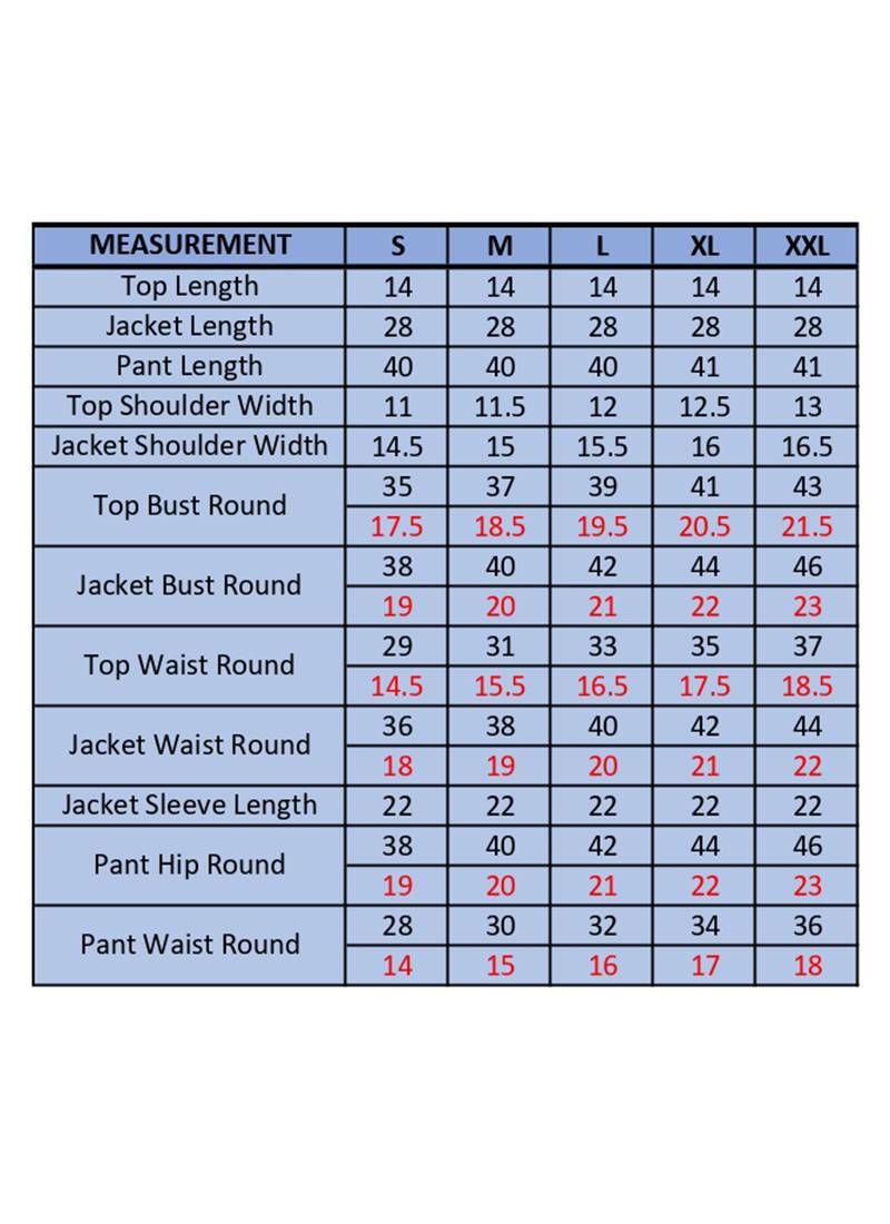 | Package Details | 1 Top / 1 Bottom / 1 Jacket | |