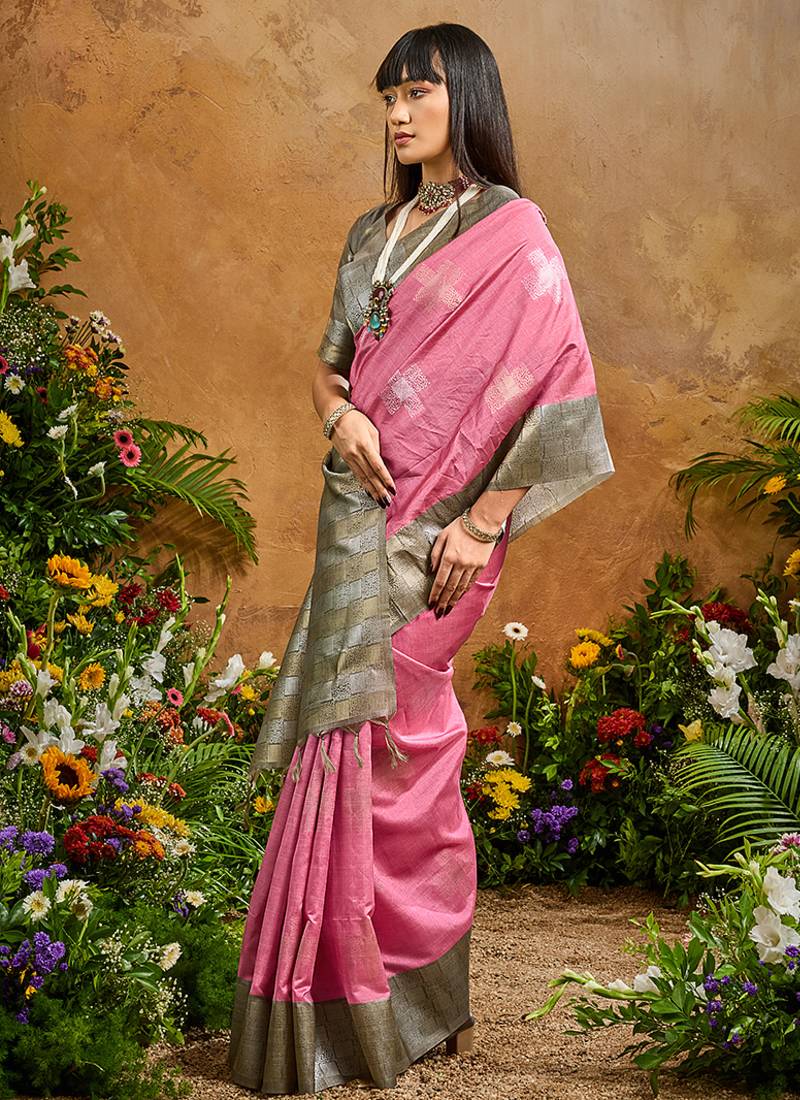Woven work art silk pink saree