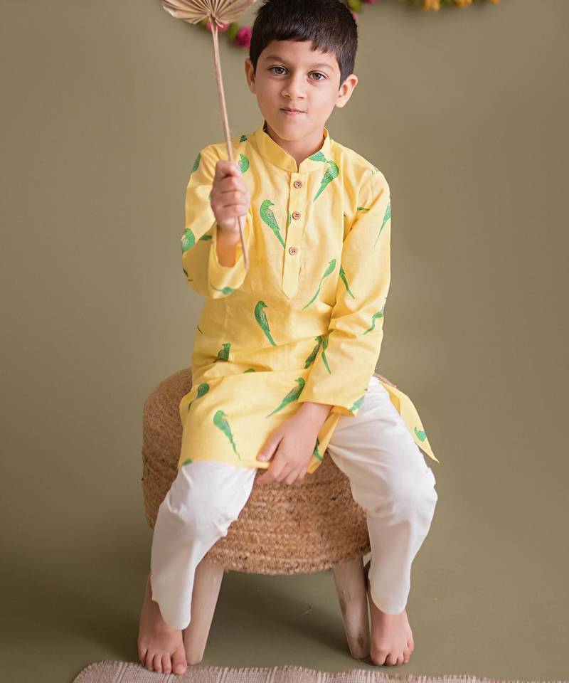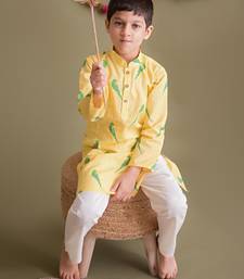 Yellow green hand screen printed boys ethnic wear- set of 2