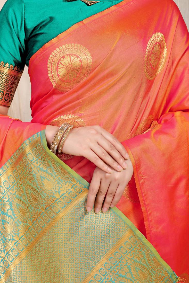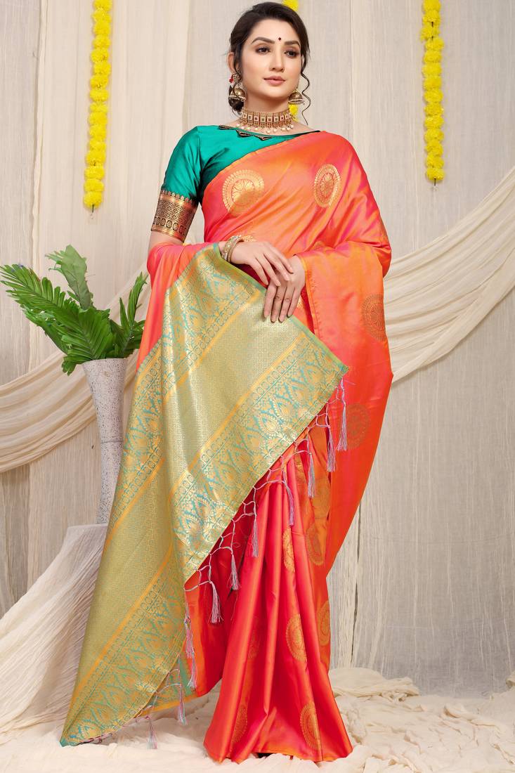 Orange banarasi silk saree with weaving work