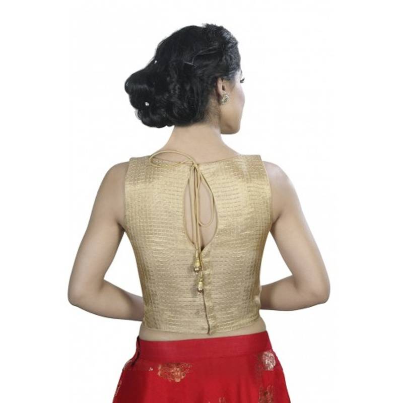 | Product Description | This Checks Tissue Sleeveless Gold Padded Blouse Can Pair With Any Saree. The Blouse Opens From Back And Has Latkans For Perfect Fit. The Cut On The Back Is Sure To Make Eyes Turn. This Long Blouse Can Also Be Worn As Crop Top With Skirt/ Denims And Pants. Padded With 2 Inch Garment Margin. Inner Lining In Crepe Cotton. Made In India. |