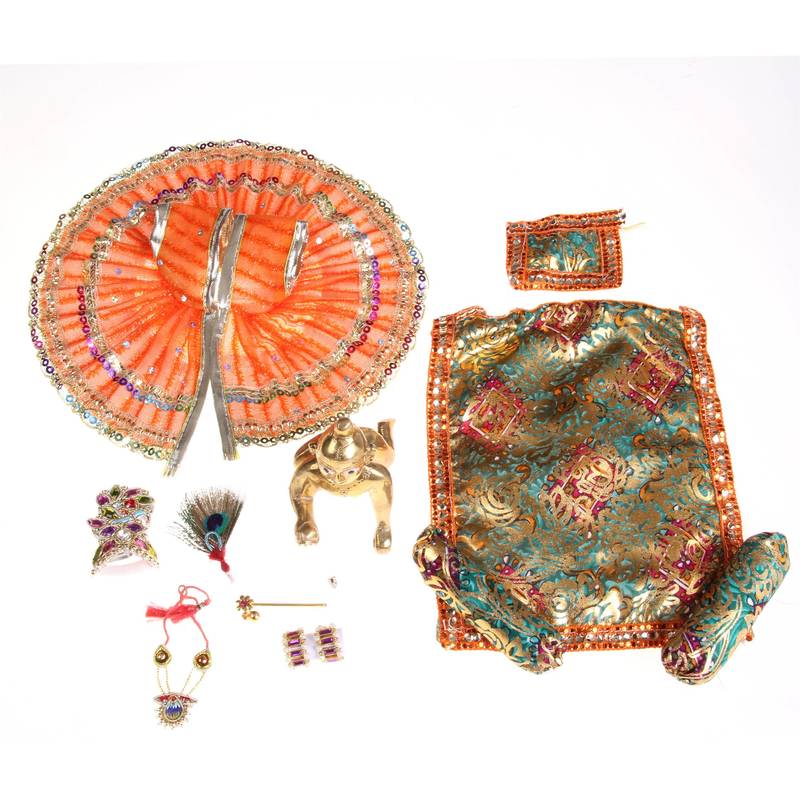 | Package Details | Laddu Gopal 10 Cm X 8 Cm X 6 Cm Sitting Pose/Orange Poshak 20 Cm Dia/Mukut/Necklace 1/A Pair Of Bangle/Tikka/Morpankh/Bansi (Flute)/Orange Bed Sheet/Matching Cushion/2 Round Pillows | |