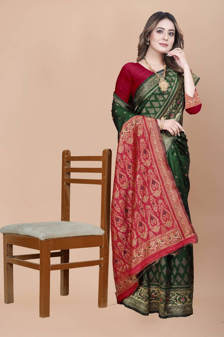 Mukhita women's green woven banarasi kota silk saree with blouse piece