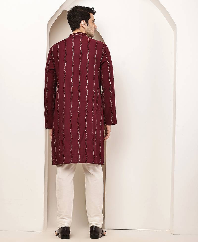 Men’s onyx maroon textured threadwork kurta
