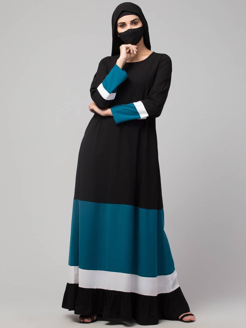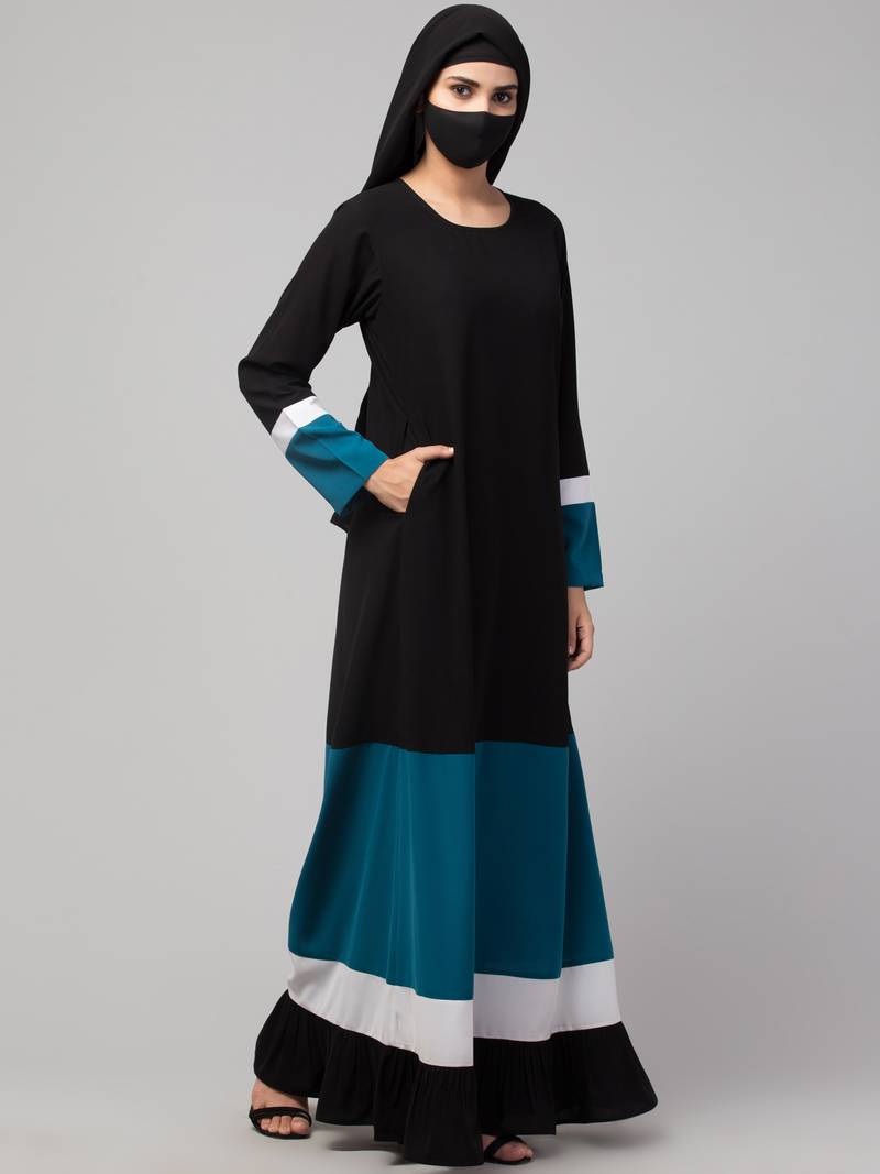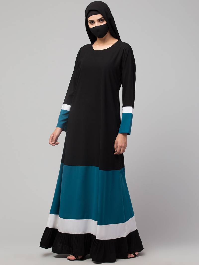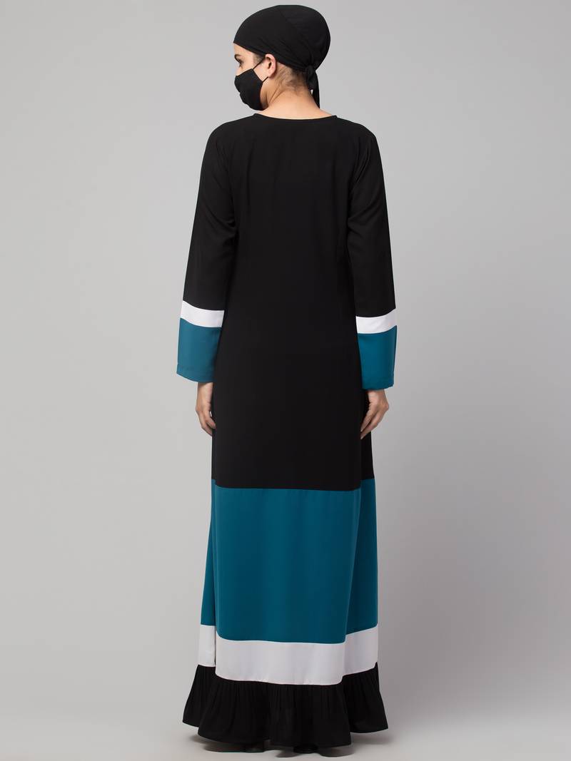 | Product Description | A Multi Colored Abaya In Four Tiers. Colourblock Tiers In Teal, White, And Black Highlight The Style. Fabric Used: Nida Matte (Kashiboo) Which Is Very Soft, Light Weight, And Easy To Maintain. It Gives A Good Fall To The Garment. Fit: Abaya Fit (Please Refer To Our Size Chart) Package: Contains One Piece Of Abaya/Dress Only Without The Other Accessories (If) Shown In The Picture(S). Wash Care: Dry Clean Or Machine Wash Cold With Like Colours And Tumble Dry Low. Warm Iron If Required. Disclaimer(S):