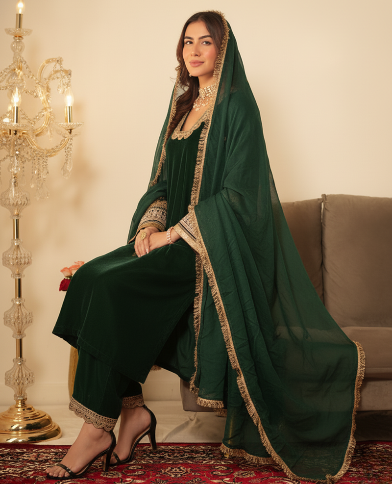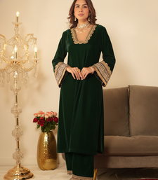| Product Name | Bottle Green Pakistani Style Suit With Ethnic Gotta Lace Work | |