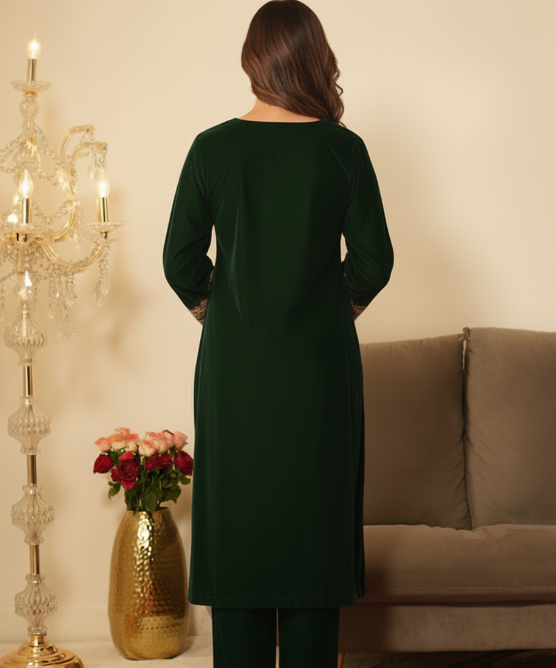 Bottle green pakistani style suit with ethnic gotta lace work