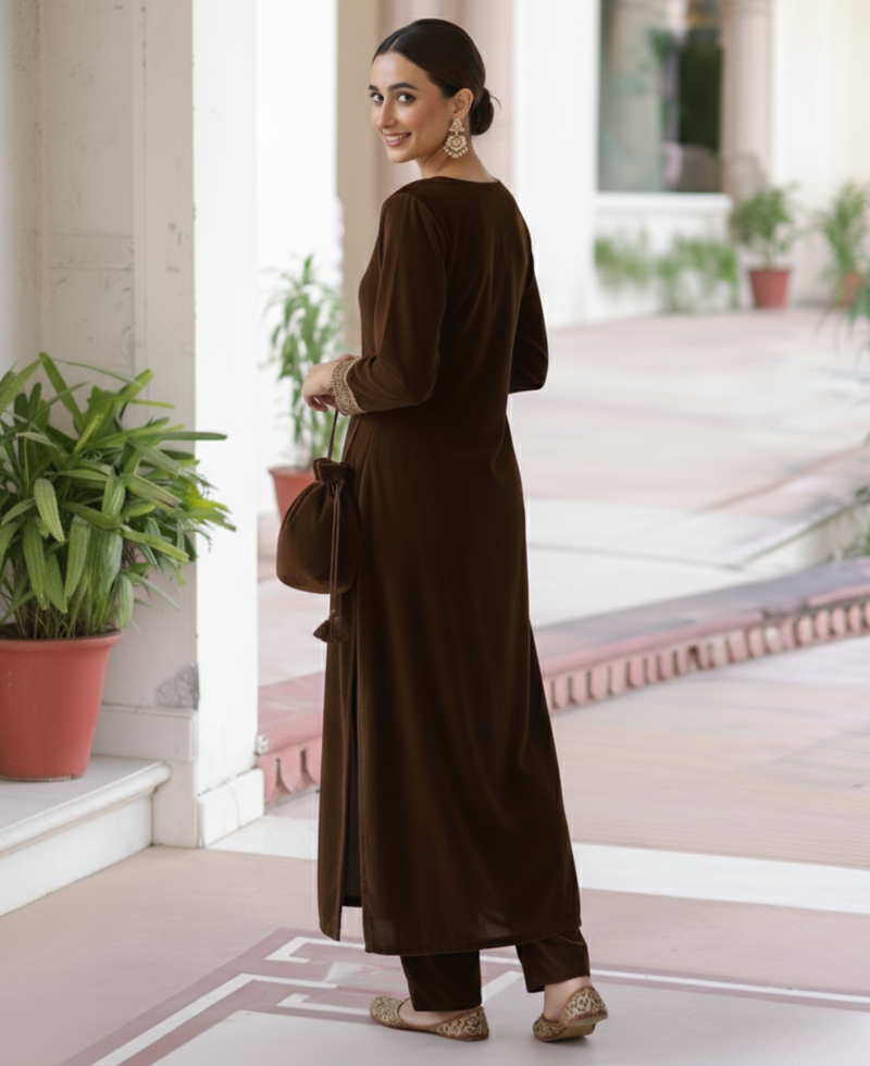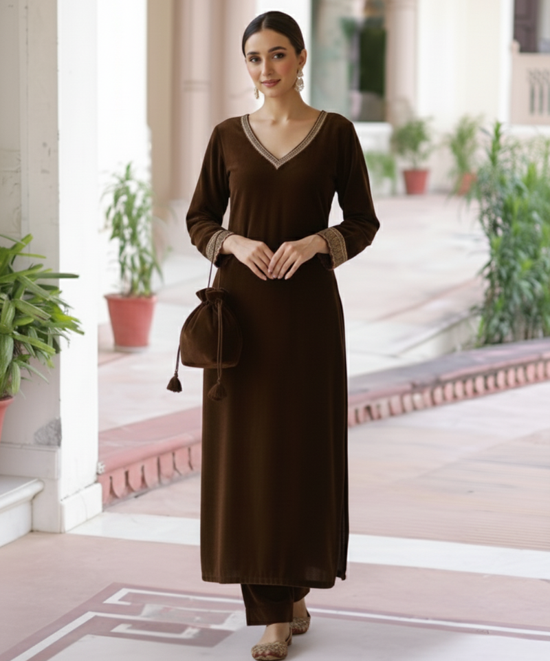 | Product Name | Brown Velvet Readymade Long Kurti Set With Potli Bag | |