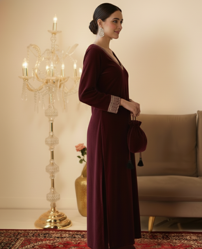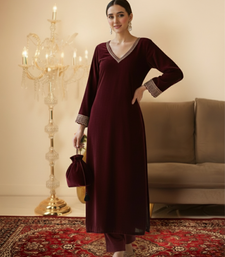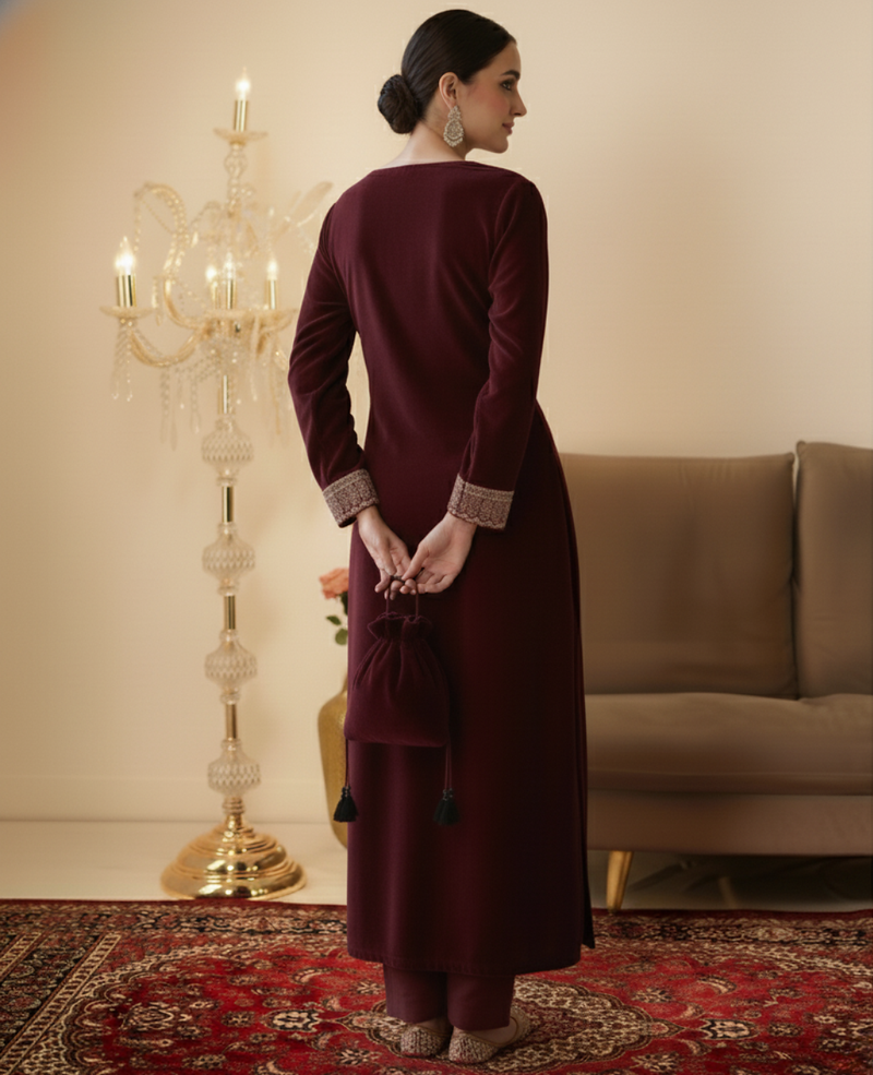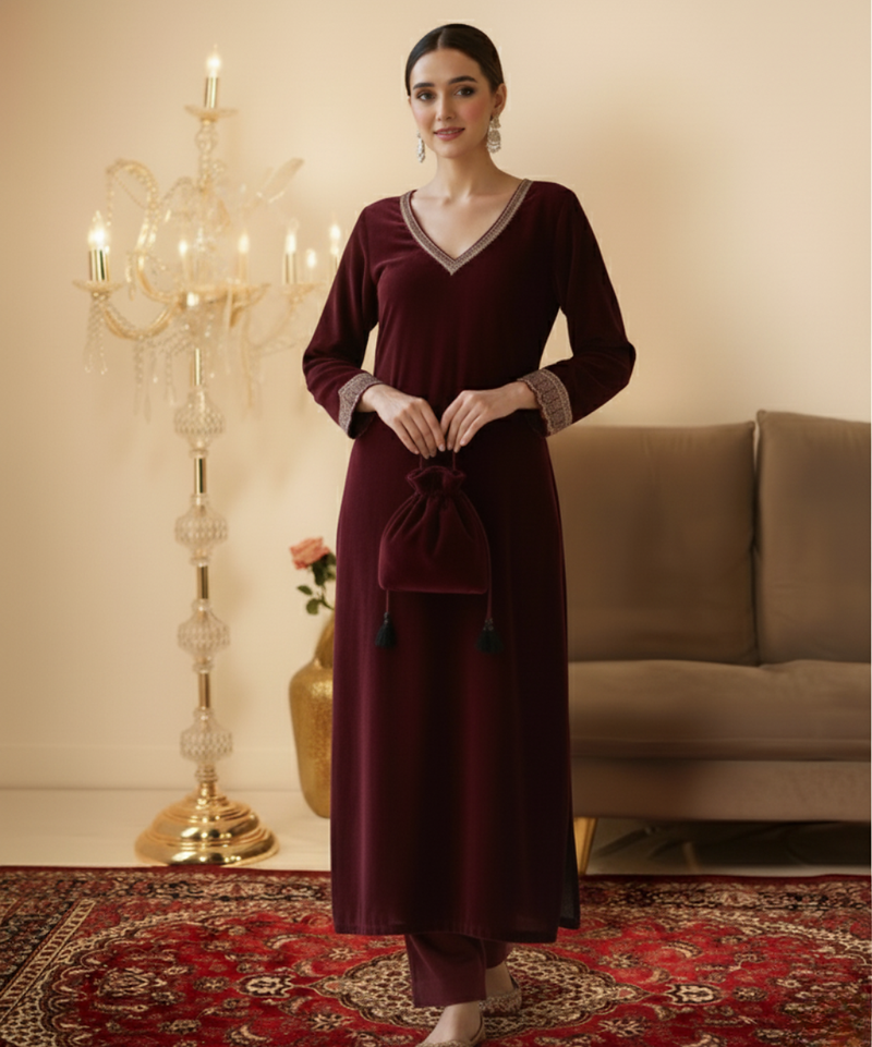| Product Name | Ethnic Maroon Velvet Straight Fit With Potli Bag | |