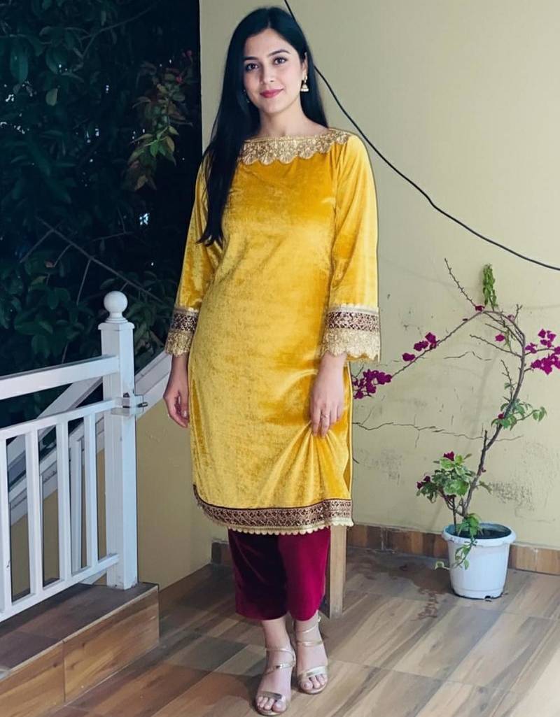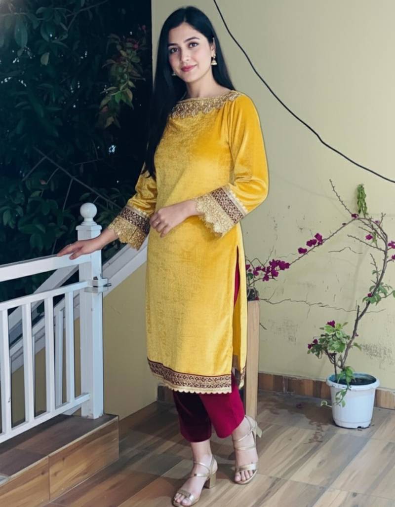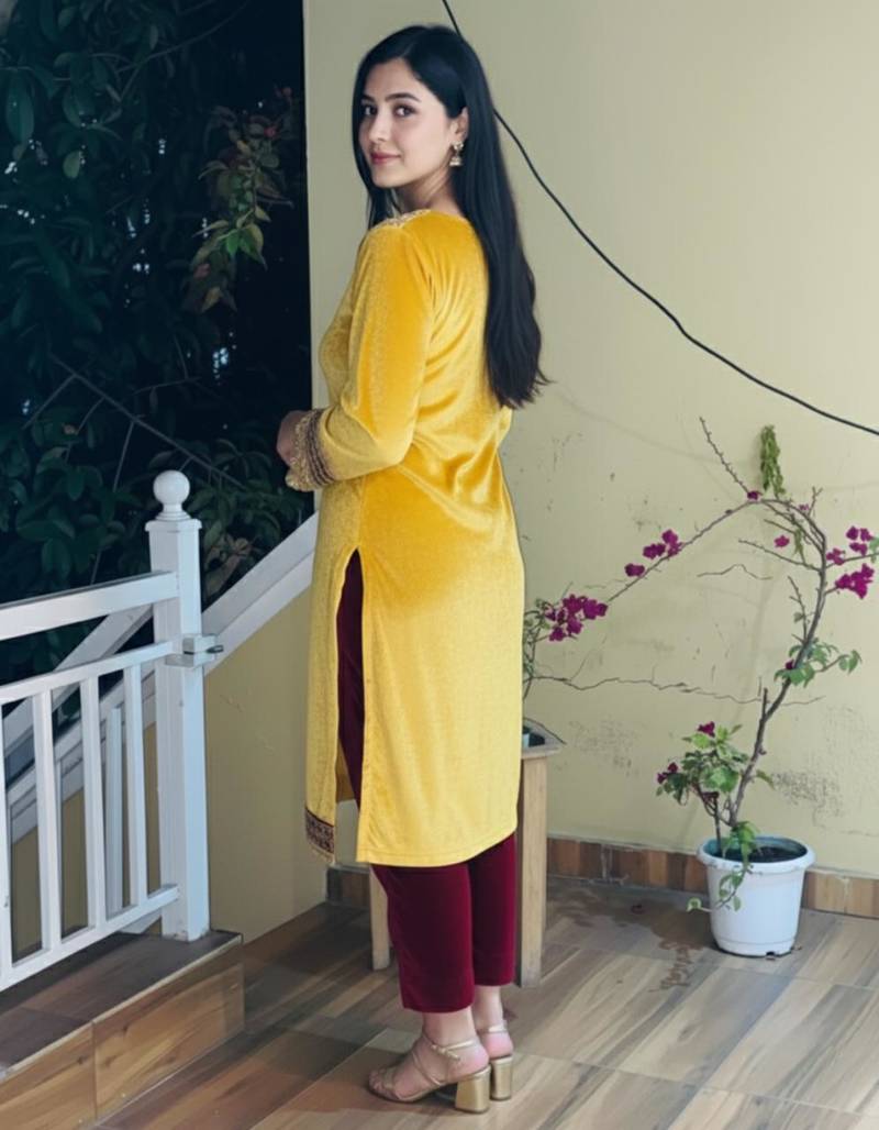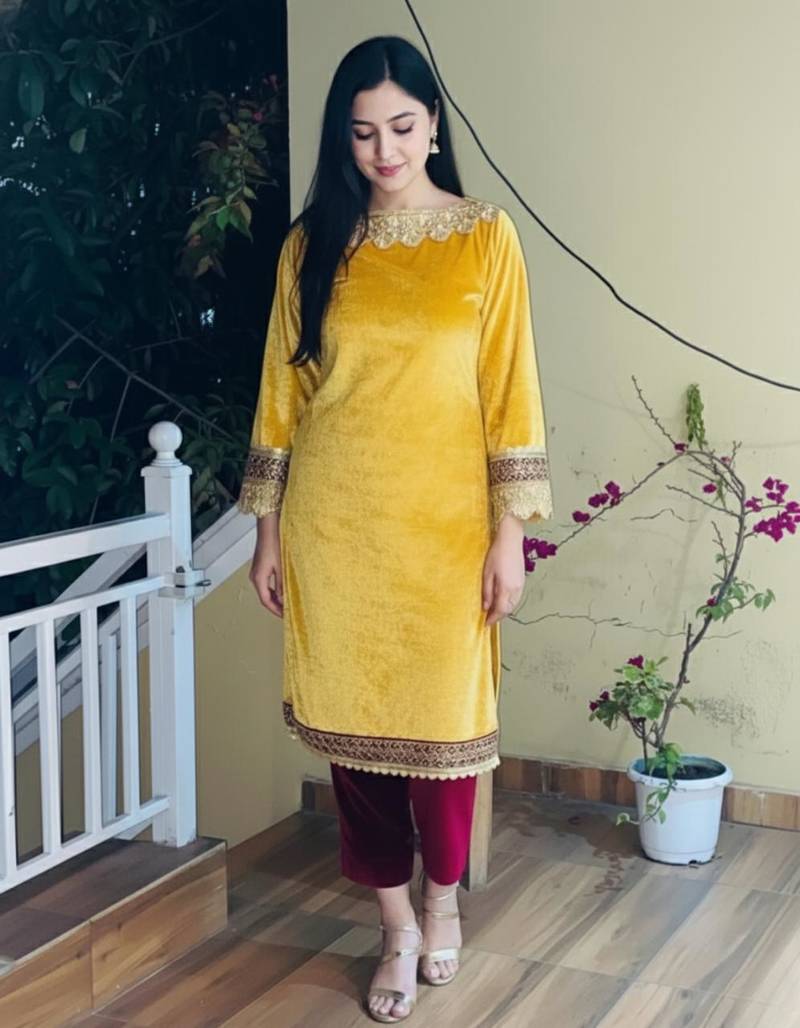 | Product Name | Yellow Velvet Kurti With Heavy Gotta Lace Work & Maroon Pant | |