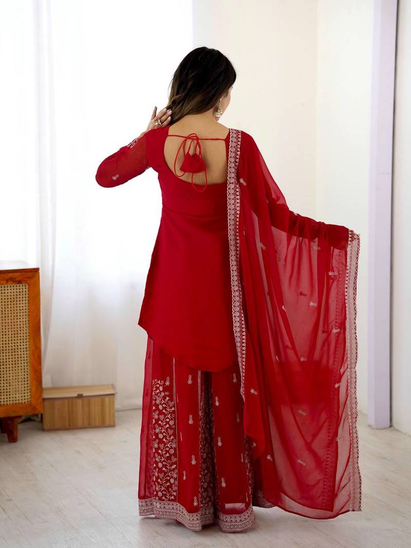 | Product Name | Zarmina Aura Thread Embroidered Red Georgette Palazzo Set | |
