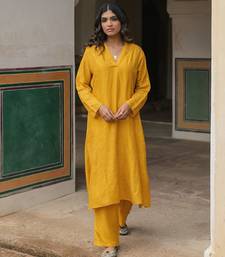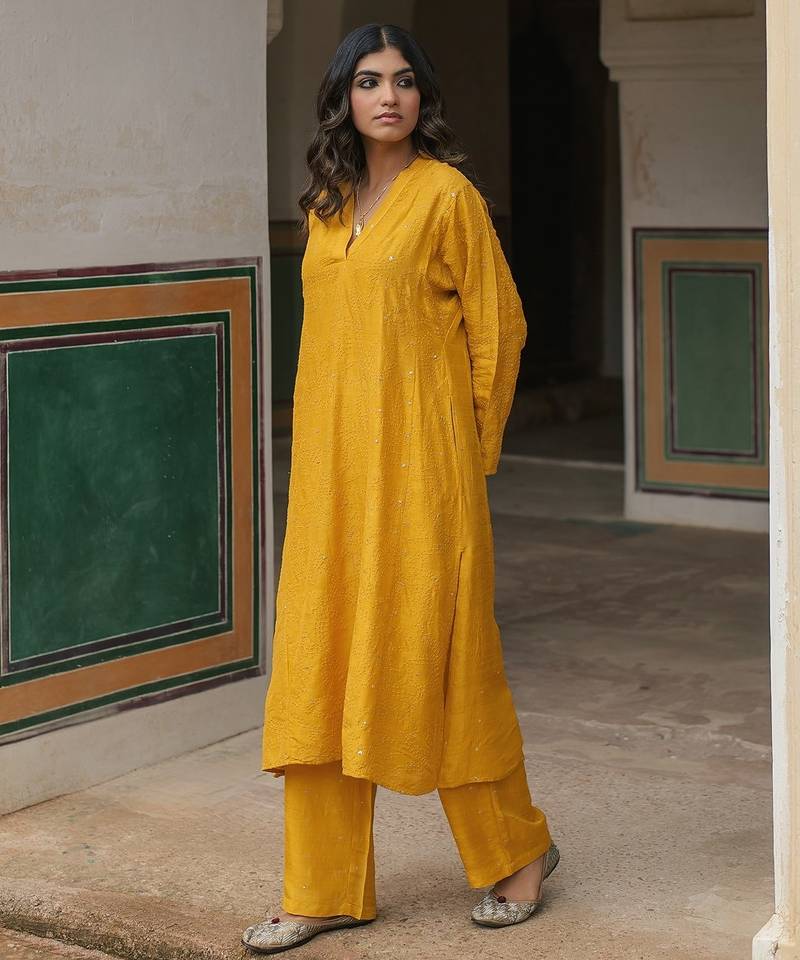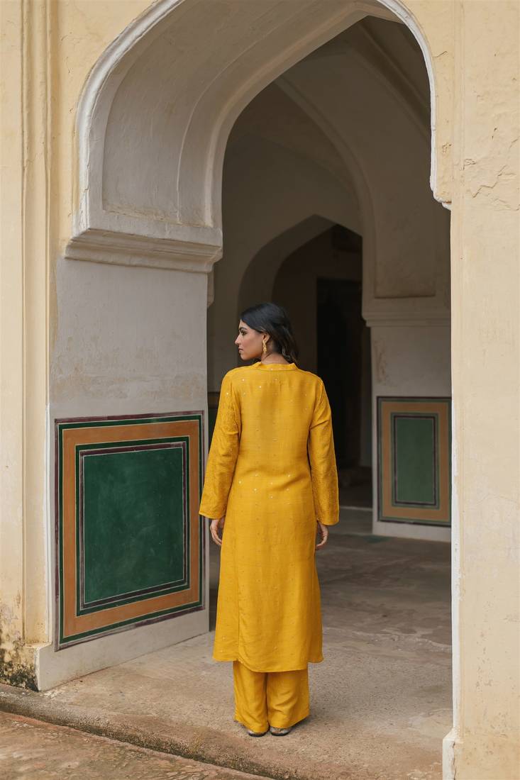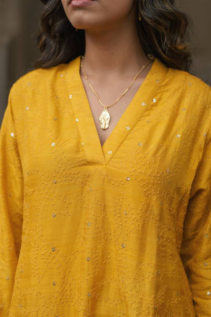 | Product Description | The Naaz Set By Naav Is A Two Piece Set In Deep Yellow Viscose Silk, Featuring A V Neck Kurta And Straight Fit Pants. The Kurta Has A Relaxed Fit With Tonal Embroidery All Over, Accented With Silver Sequin Embroidery For A Subtle Shimmer. |