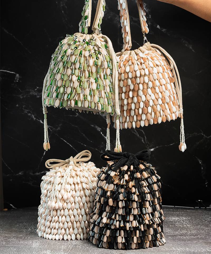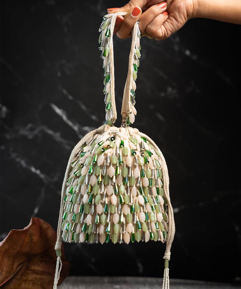 | Product Description | This Tasseled Potli Is A Stunning Blend Of Elegance And Craftsmanship, Featuring Lustrous Beads And Intricate Work In A Cream And Green Palette. Finished With Delicate Tassels, It’s The Perfect Accessory For Weddings, Festive Events, Or Evening Soirées.